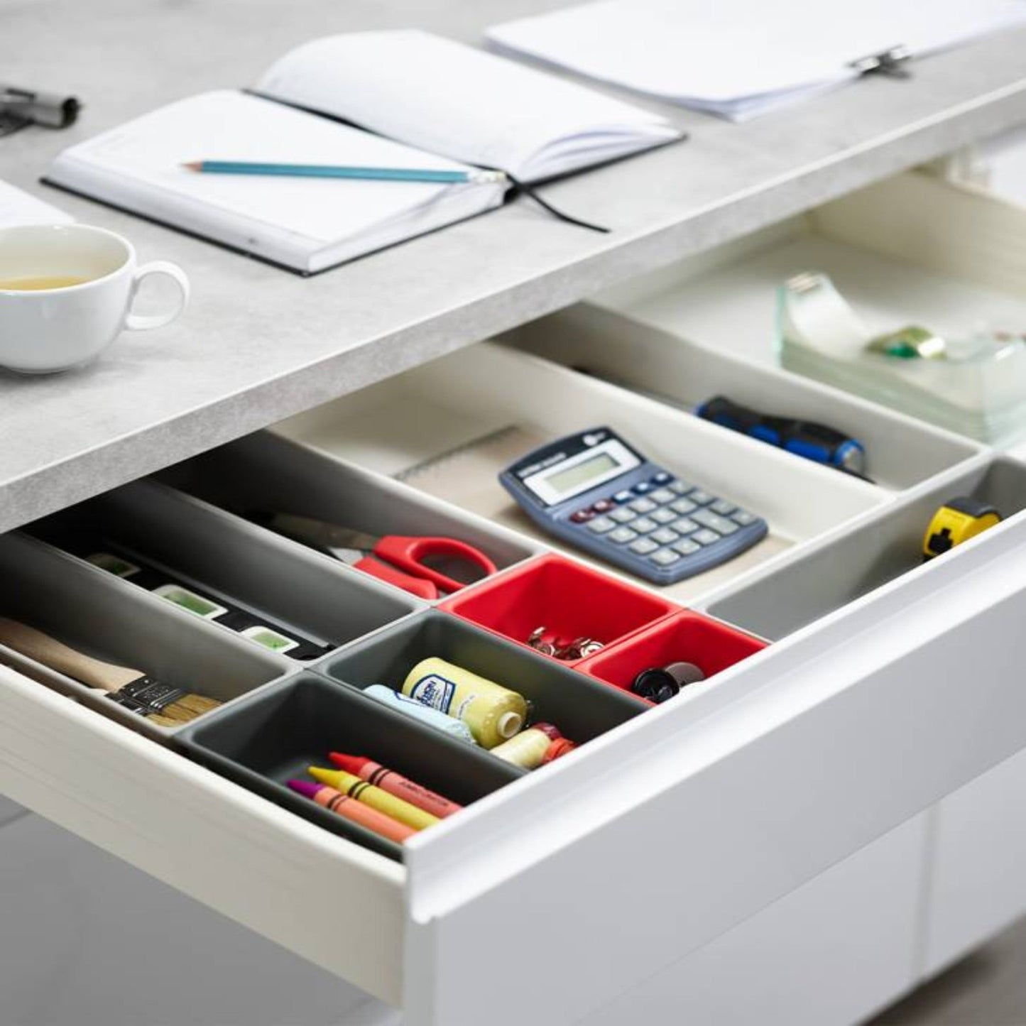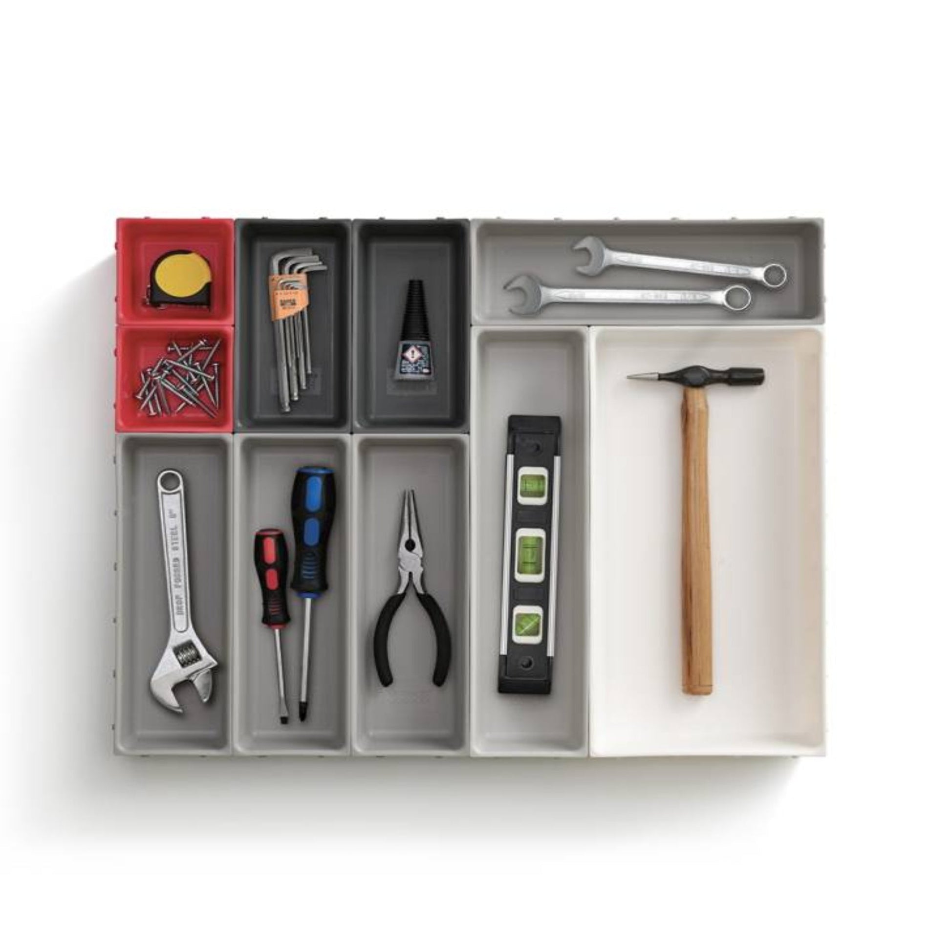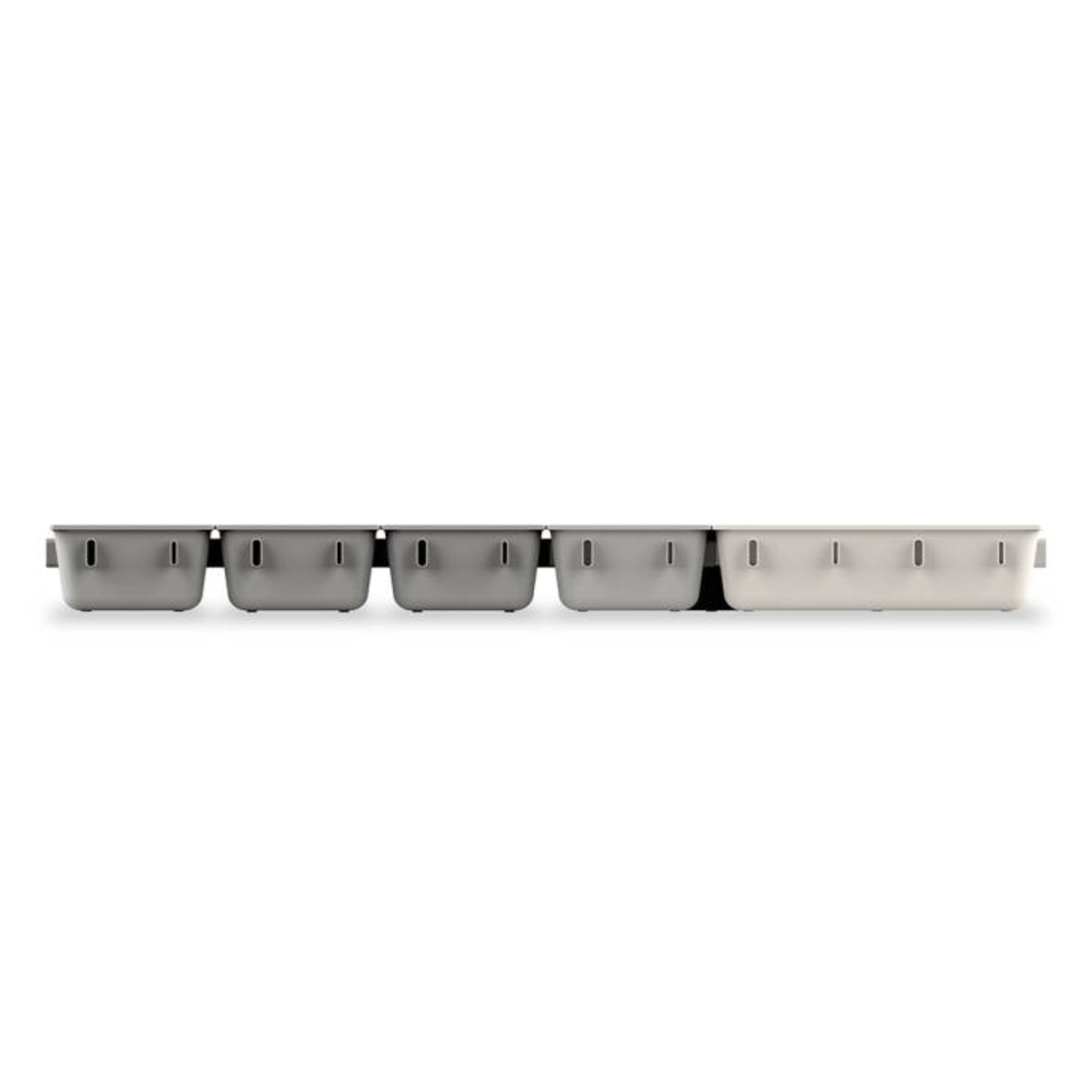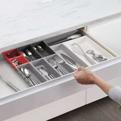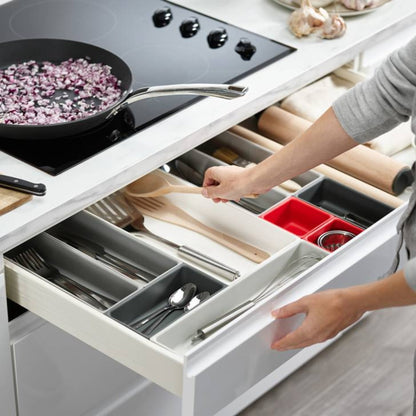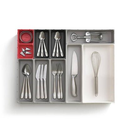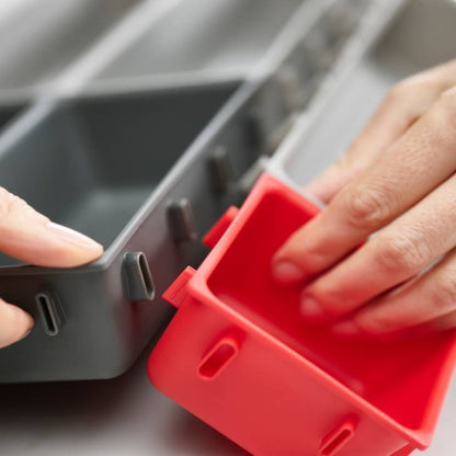 El Set Organizador Cajones Blox 10 Piezas Joseph Joseph incluye 10 bandejas que se enganchan entre si para que puedas usarlas juntas o por separado, adaptándose al tamaño de tus cajones. Este sistema modular te permite diferentes combinaciones dependiendo de tus necesidades. Son perfectas para guardar utensilios de cocina, cubiertos, maquillaje, joyas y artículos de escritorio separando cada elemento en una bandeja distinta. Todas tienen pies antideslizantes para evitar que se muevan dentro del cajón. Incluye 10 bandejas: 2 de 8,5x8,5cm, 2 de 8,5x17,5cm, 4 de 8,5x26cm, 1 de 8,5x34,5cm, 1 de 17,5x34,5cm