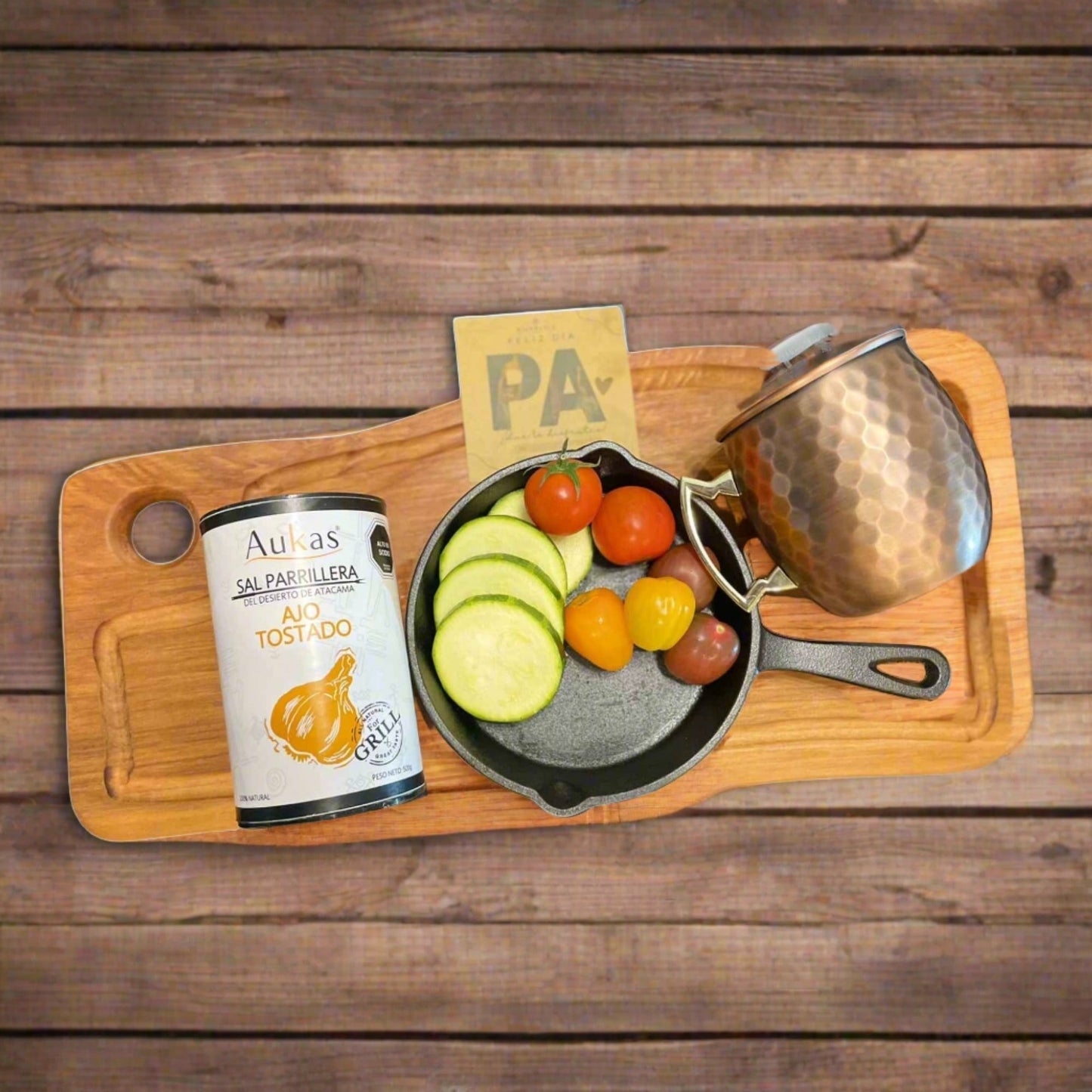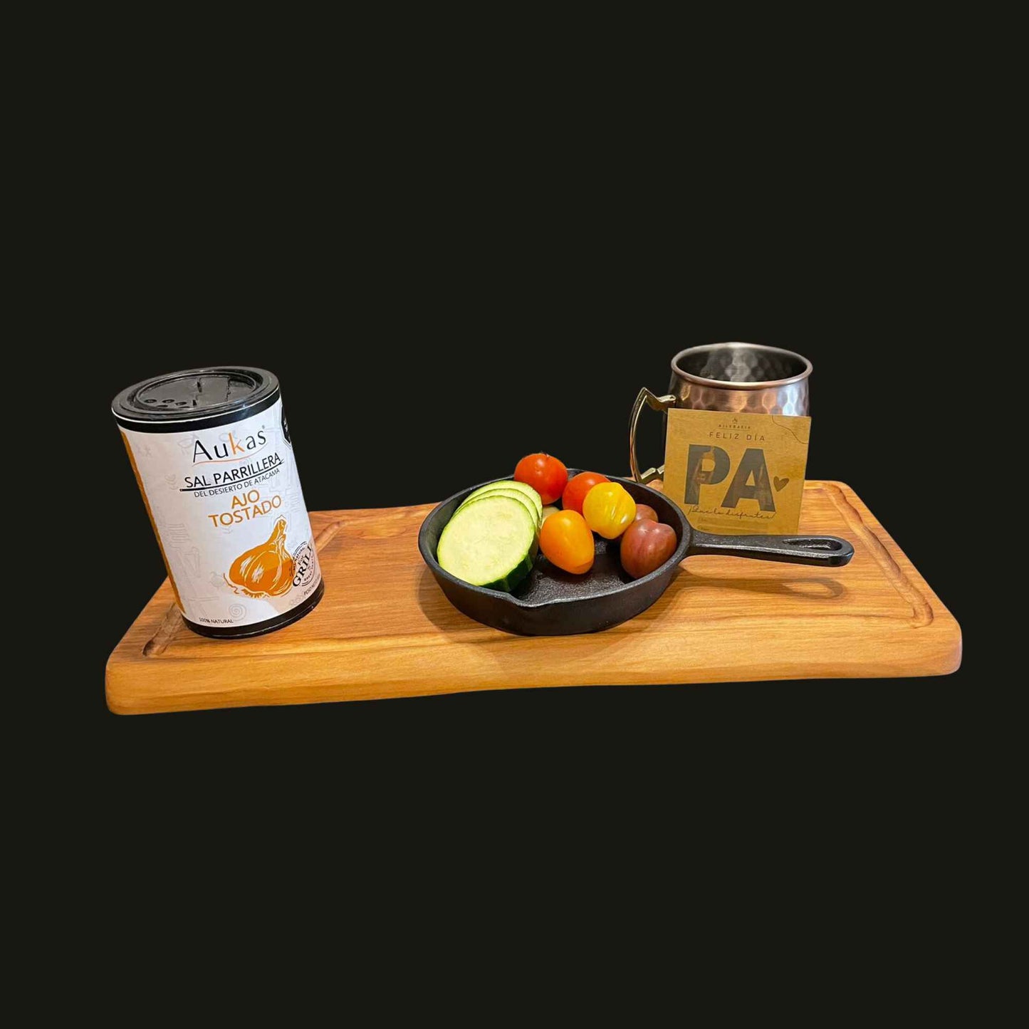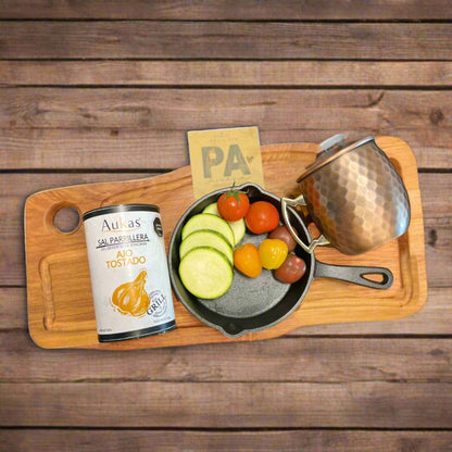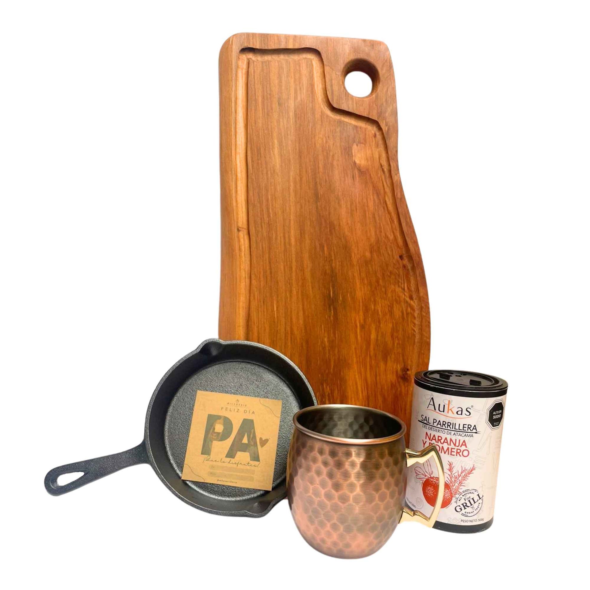 Pack incluye: una tabla de 45 cm de madera nativa, un sartén de 15 cm de hierro fundido, apta para parrilla a gas o carbón, 500 grs de sal parrillera Aukas, un vaso de cobre de 580 cc.
