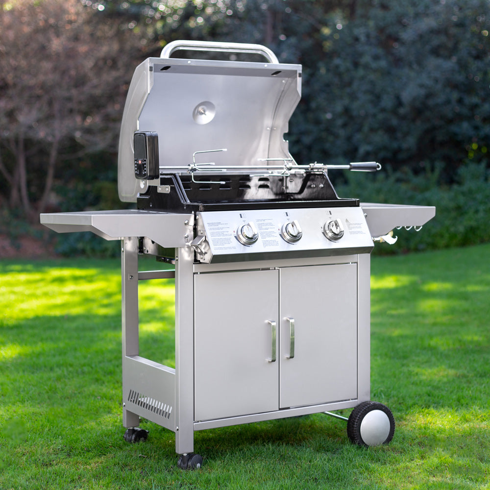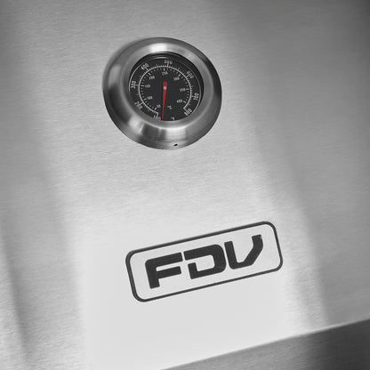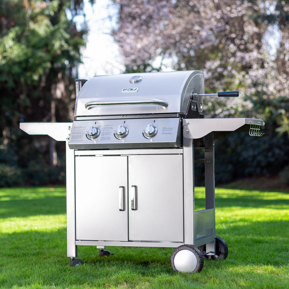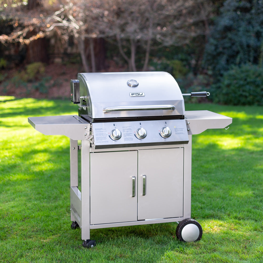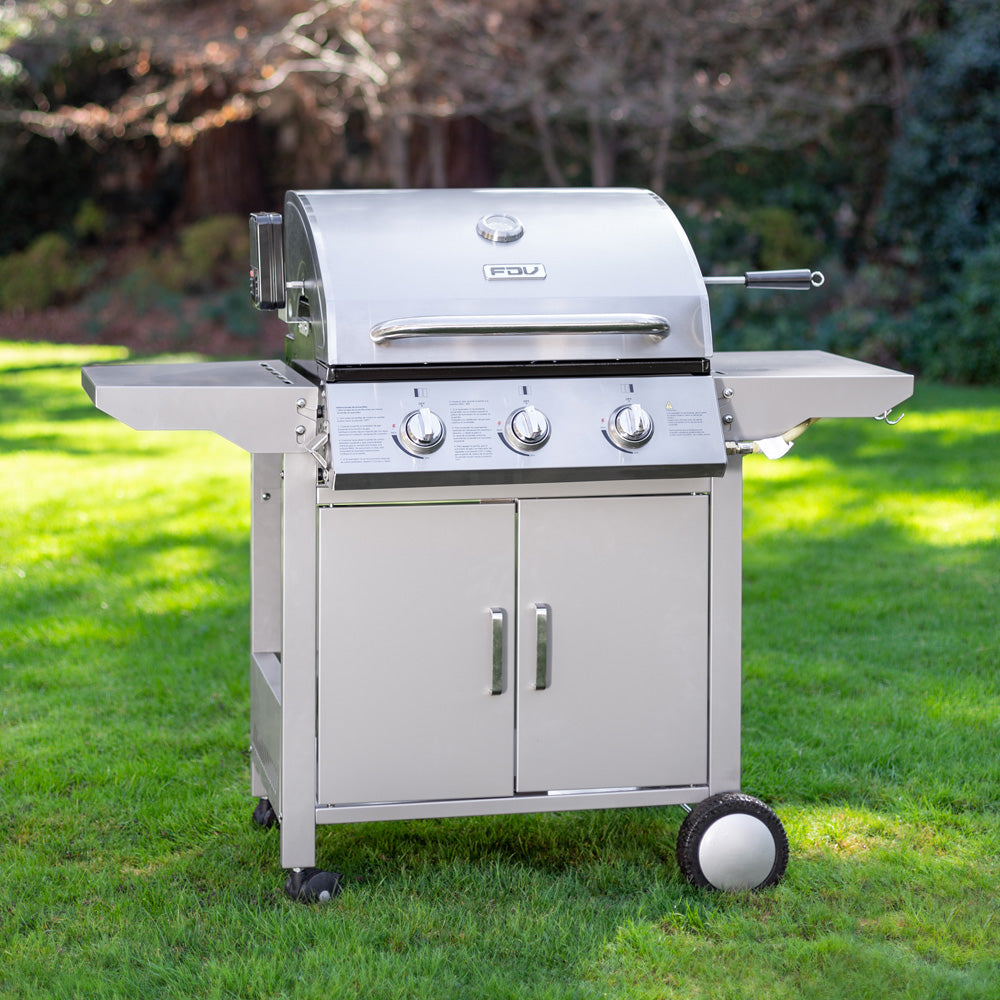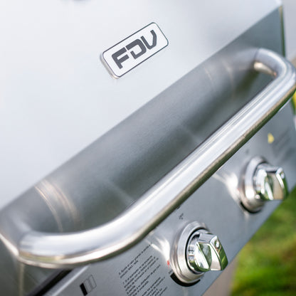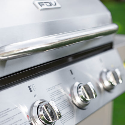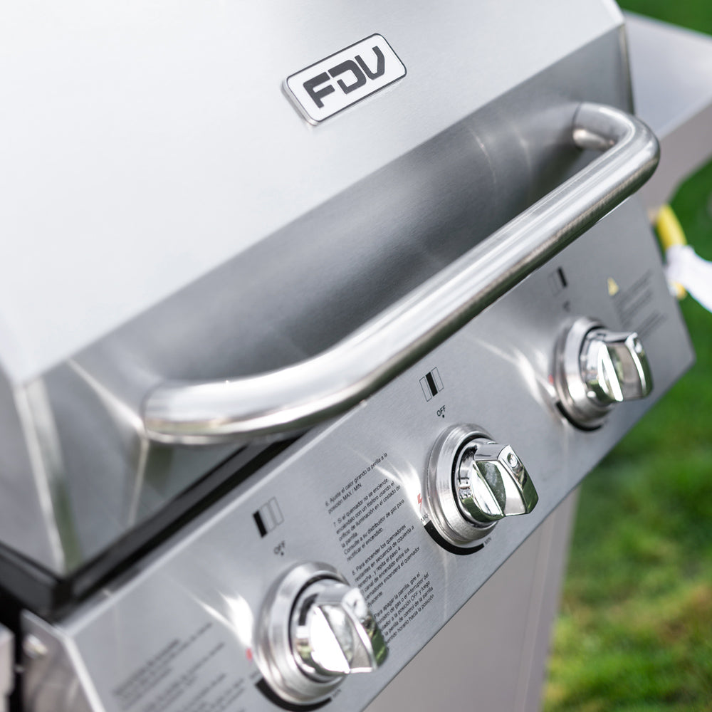 La parrilla a gas de acero inoxidable FDV es lo que necesitas para salir triunfante en cada asado. Una parrilla a gas 3 quemadores que cuenta con encendido eléctrico, termostato, 2 Parrillas independientes y 1 Parrilla pequeña superior.