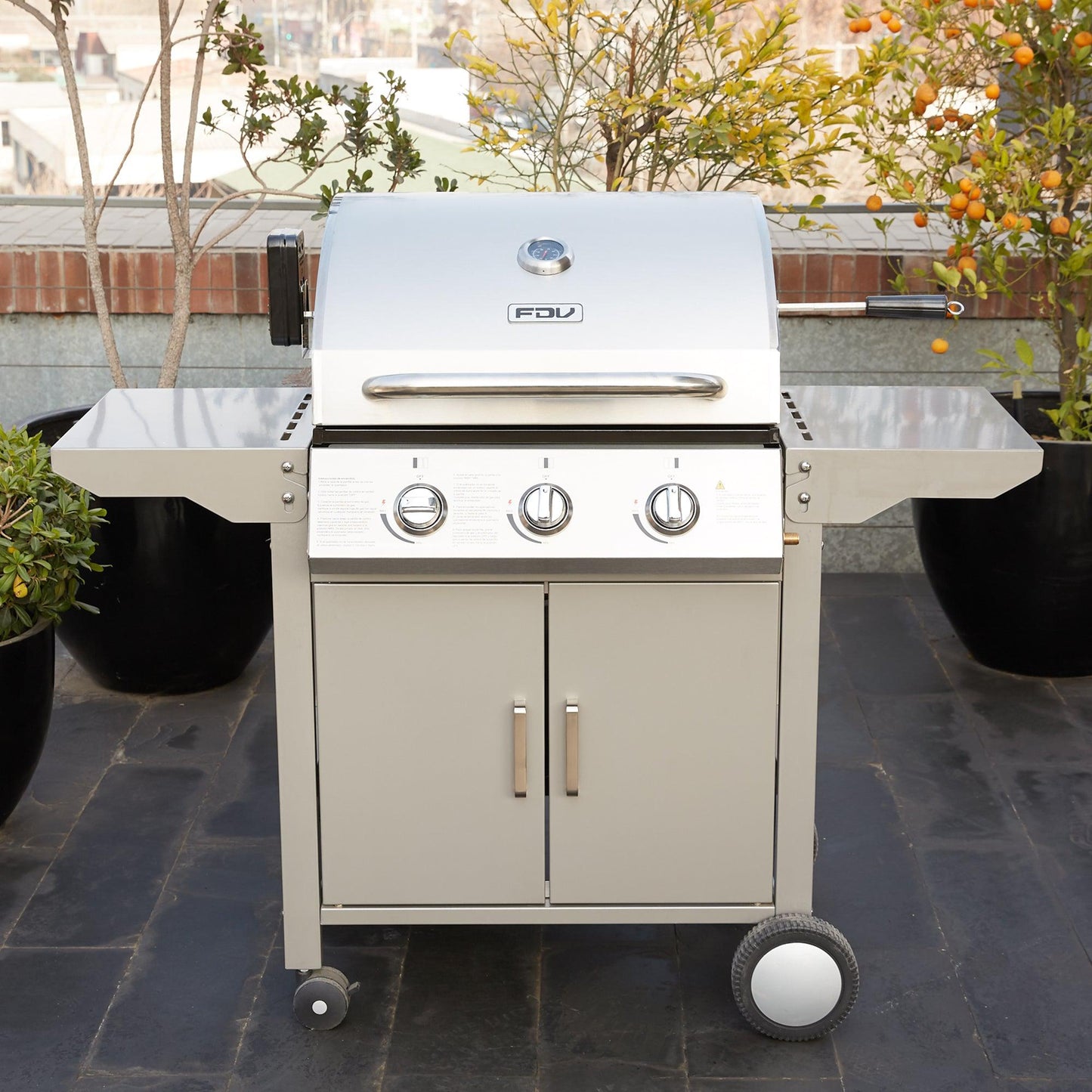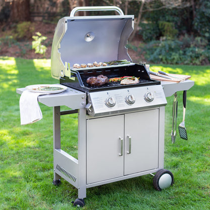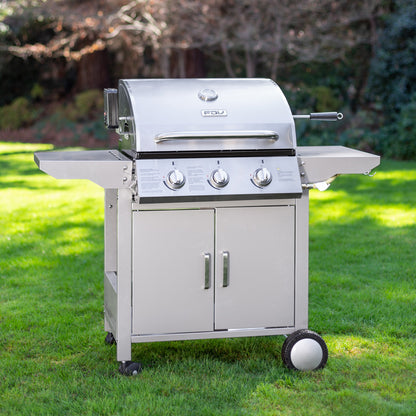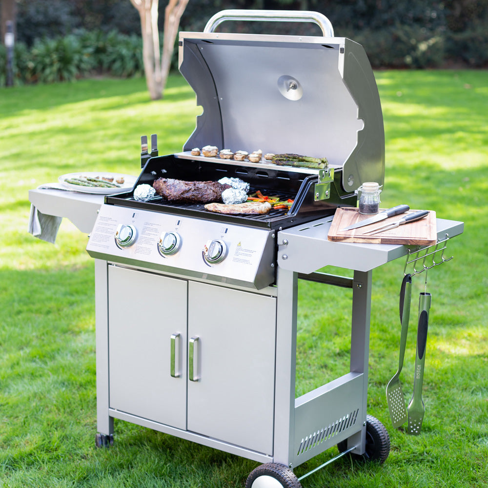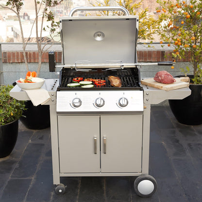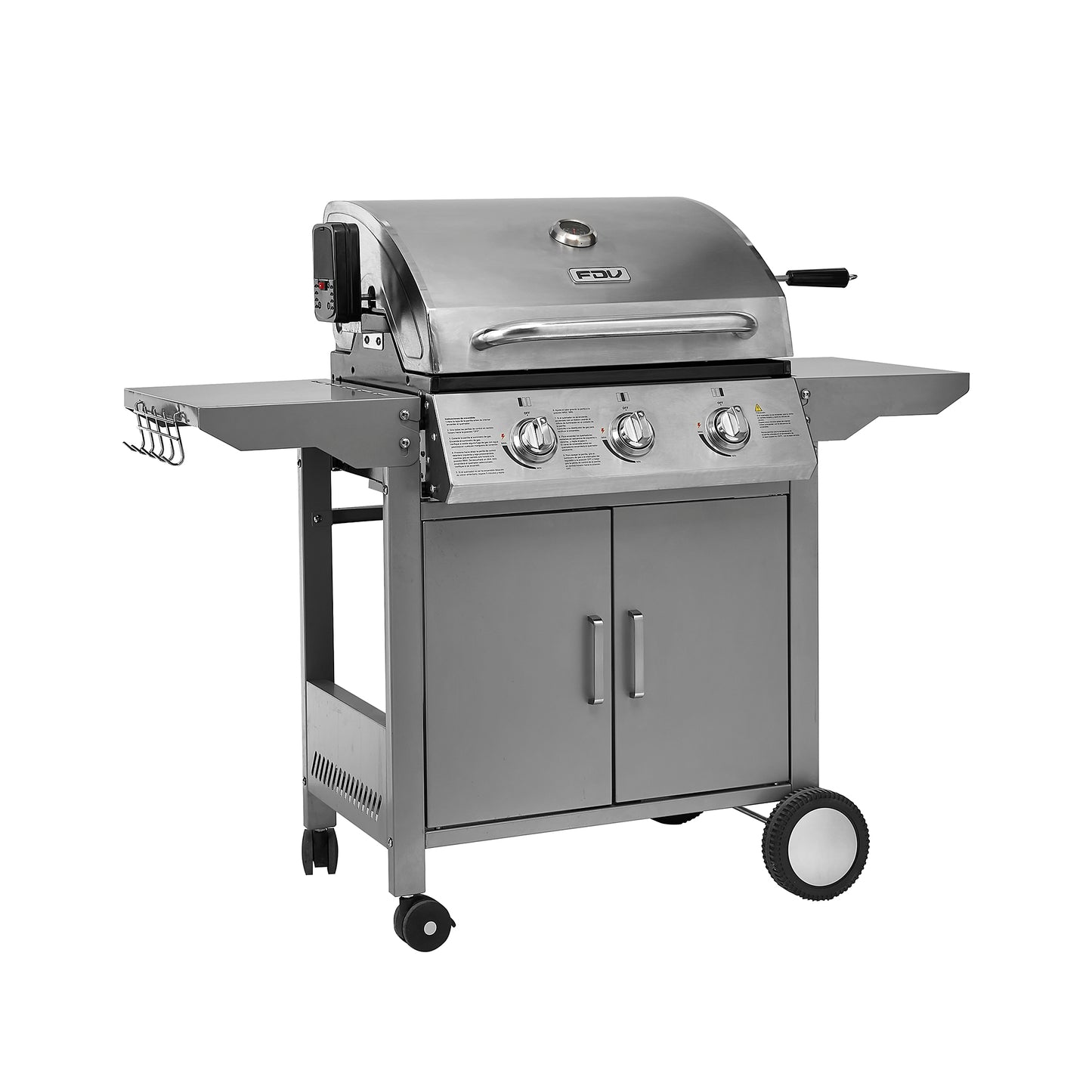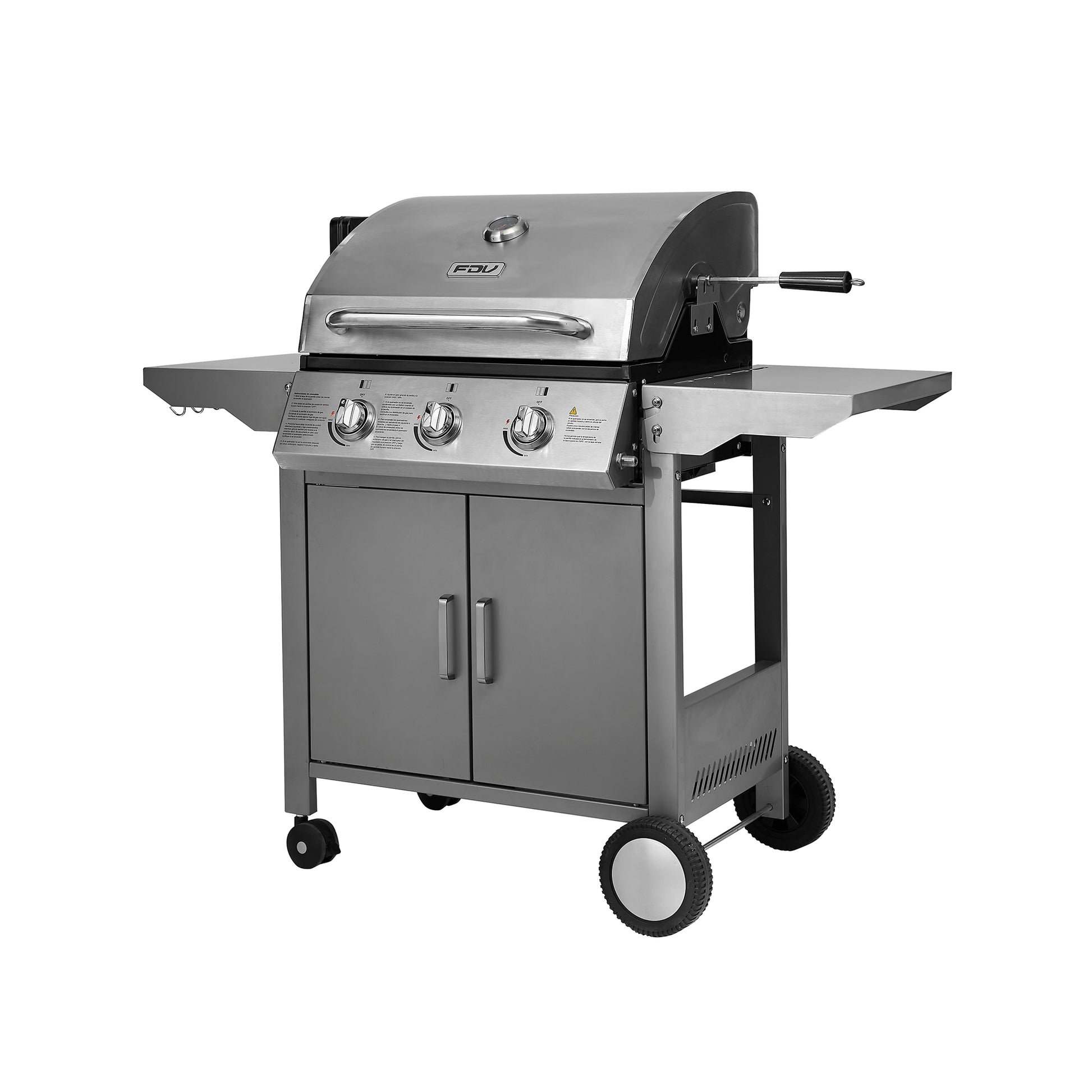 La parrilla a gas de acero inoxidable FDV es lo que necesitas para salir triunfante en cada asado. Una parrilla a gas 3 quemadores que cuenta con encendido eléctrico, termostato, 2 Parrillas independientes y 1 Parrilla pequeña superior.