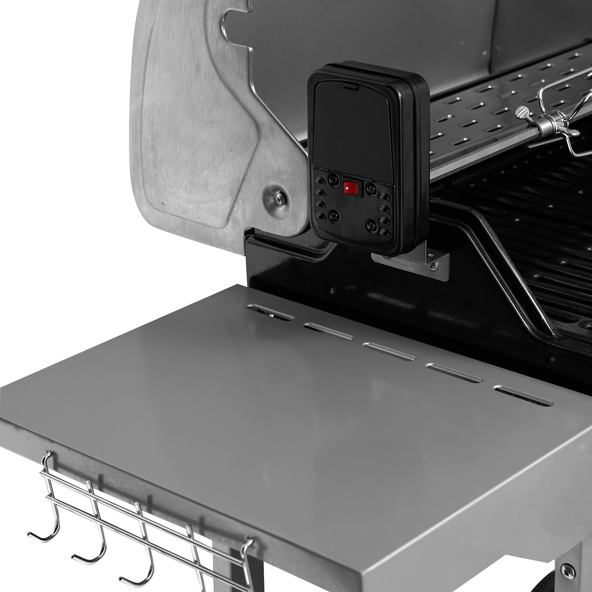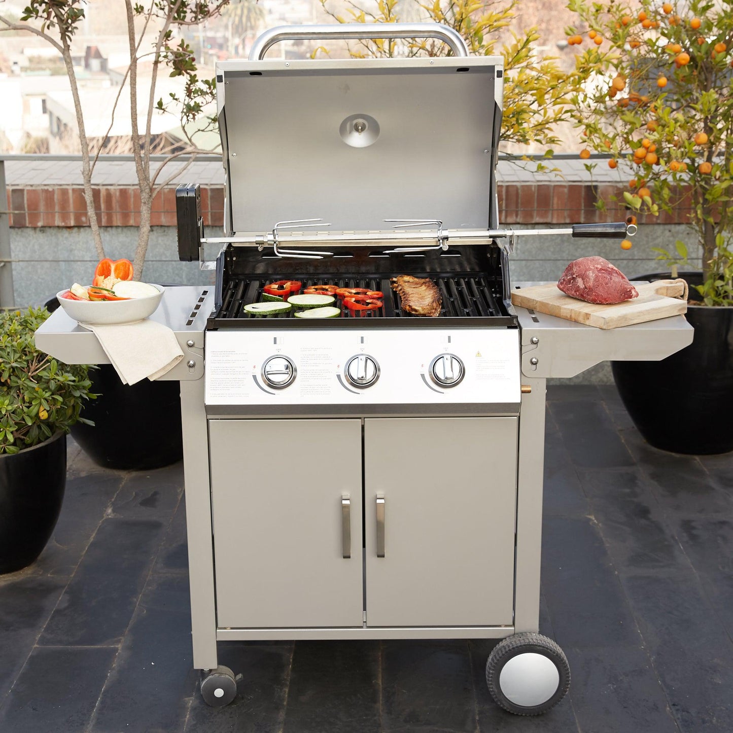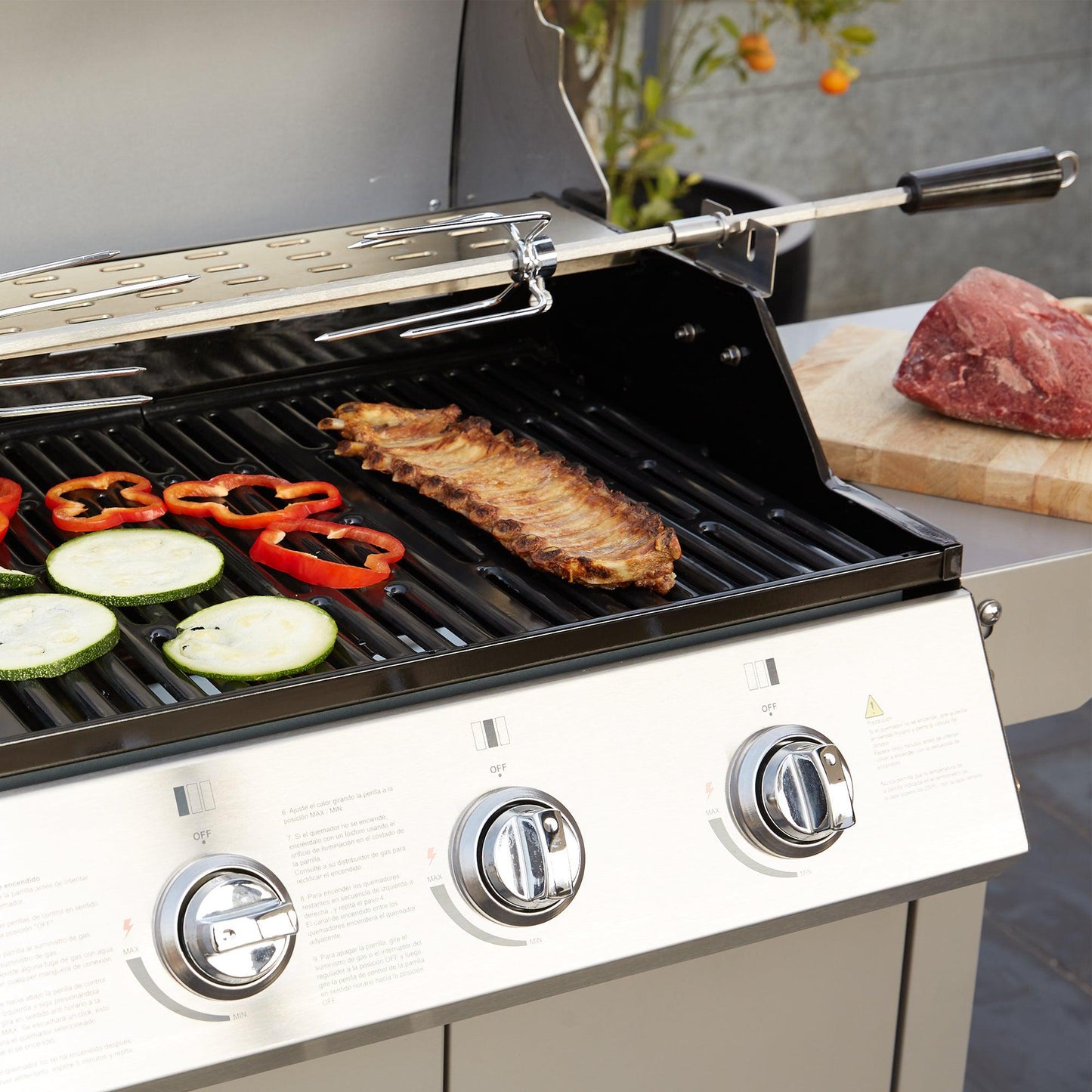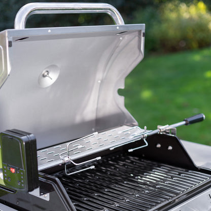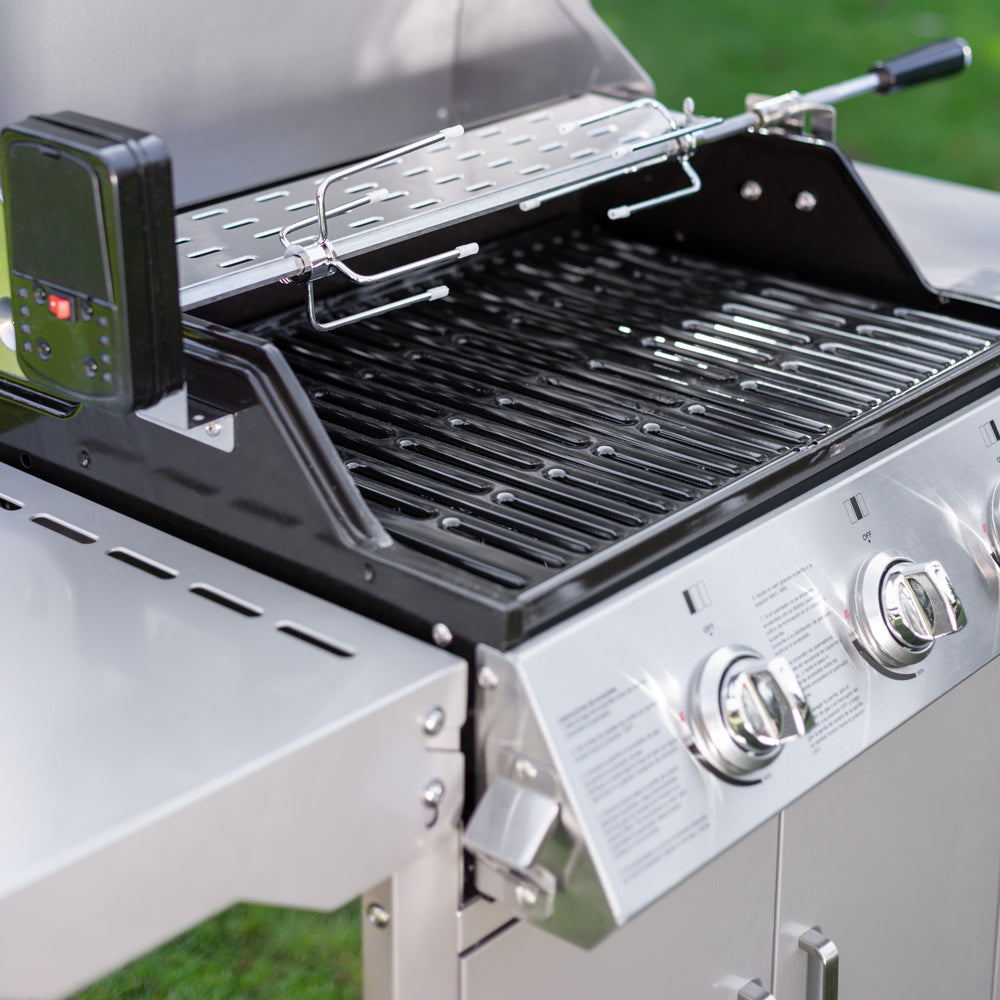 Esta parrilla para el asado perfecto cuenta con accesorios ideales: Regulador + Flexible, Spiedo con motor, funda protectora, abridor de botella y ganchos para colgar utensilios.
