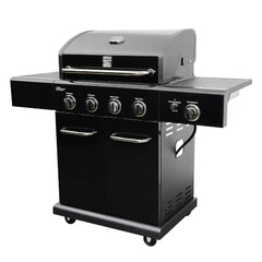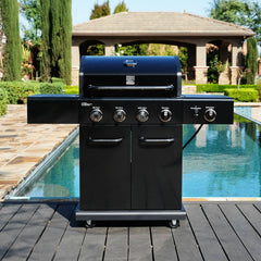 Parrilla a gas de 4 quemadores con sellador y bandeja lateral, ideal para las juntas en familia o entre amigos, El diseño interior ofrece el espacio para asar en rejillas de acero inoxidable de alta calidad. Cada quemador se controla con un encendido electrónico independiente, lo que le proporciona un control más preciso de tus comidas. También tiene un sellador lateral (12.000 BTU), para fijar el sabor de deliciosos y jugosas carnes y otros alimentos, y un estante calentador para mantener los aperitivos y acompañamientos listos para servir. La atractiva construcción de color negro y detalles de cobre cromado proporciona durabilidad, resistencia y estilo.