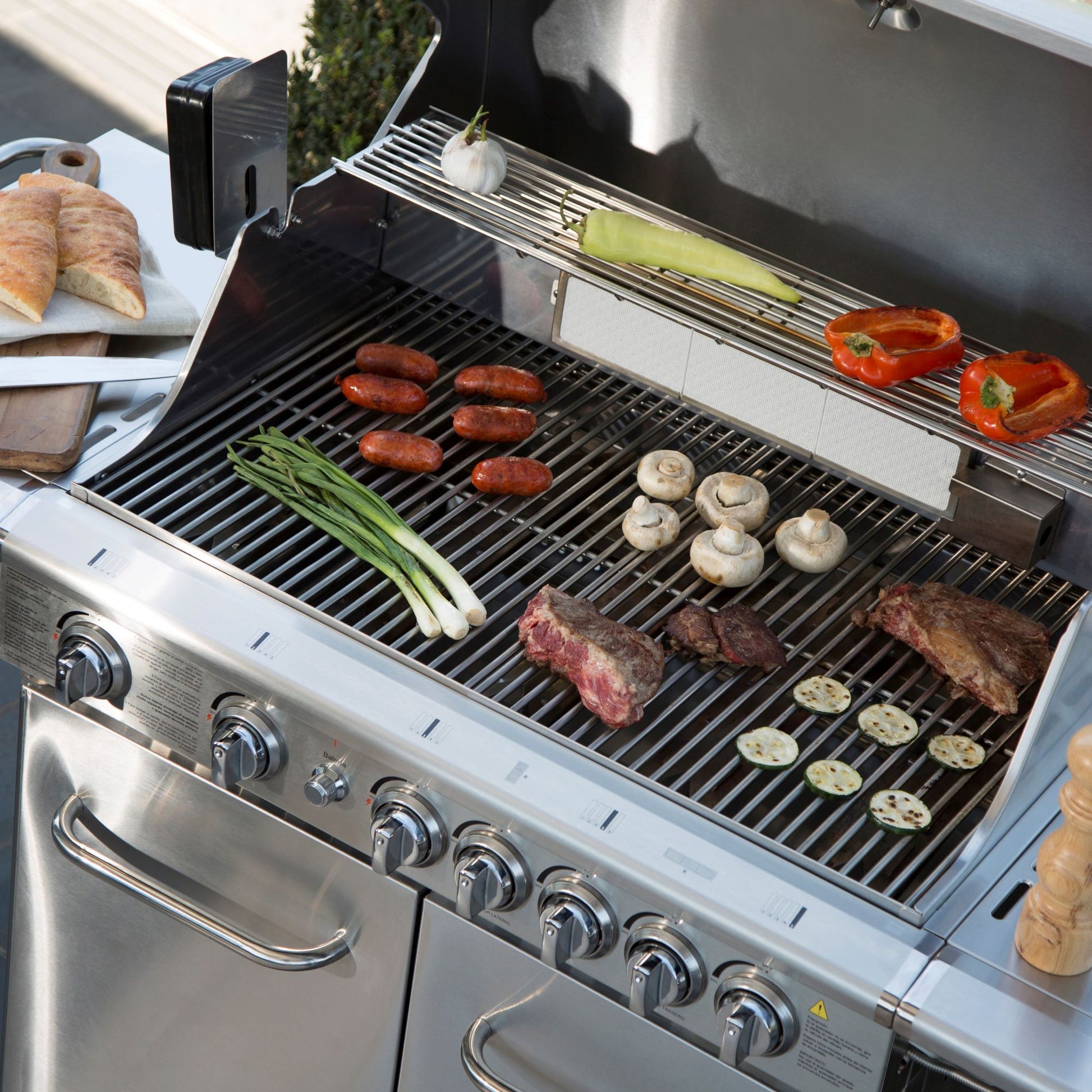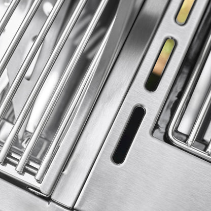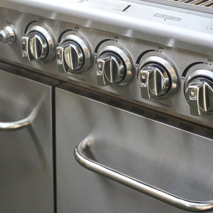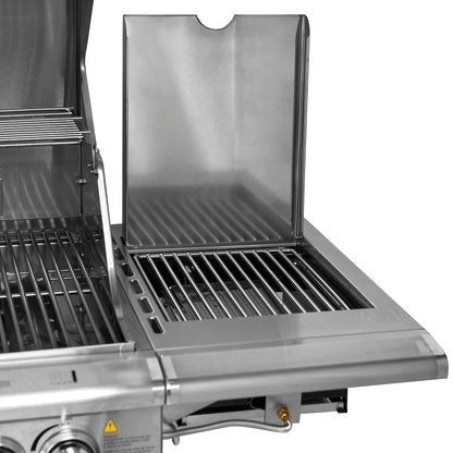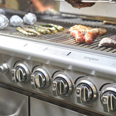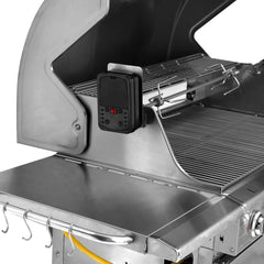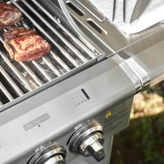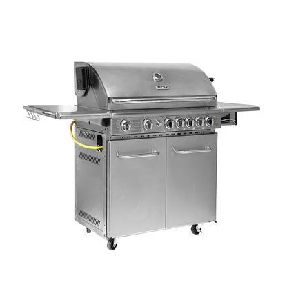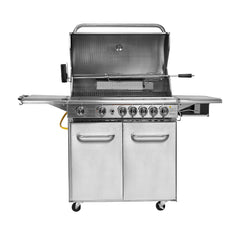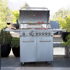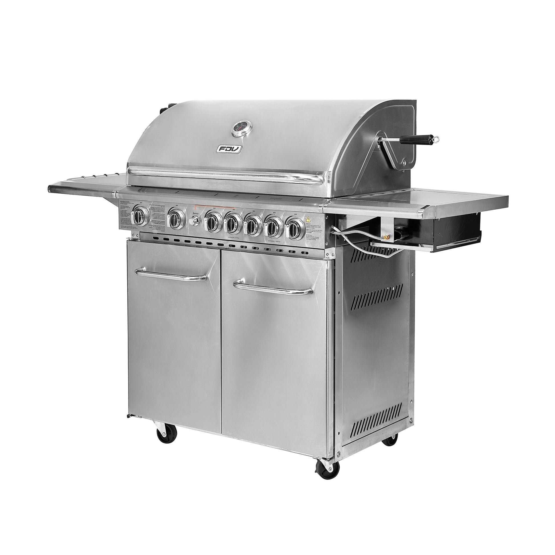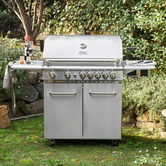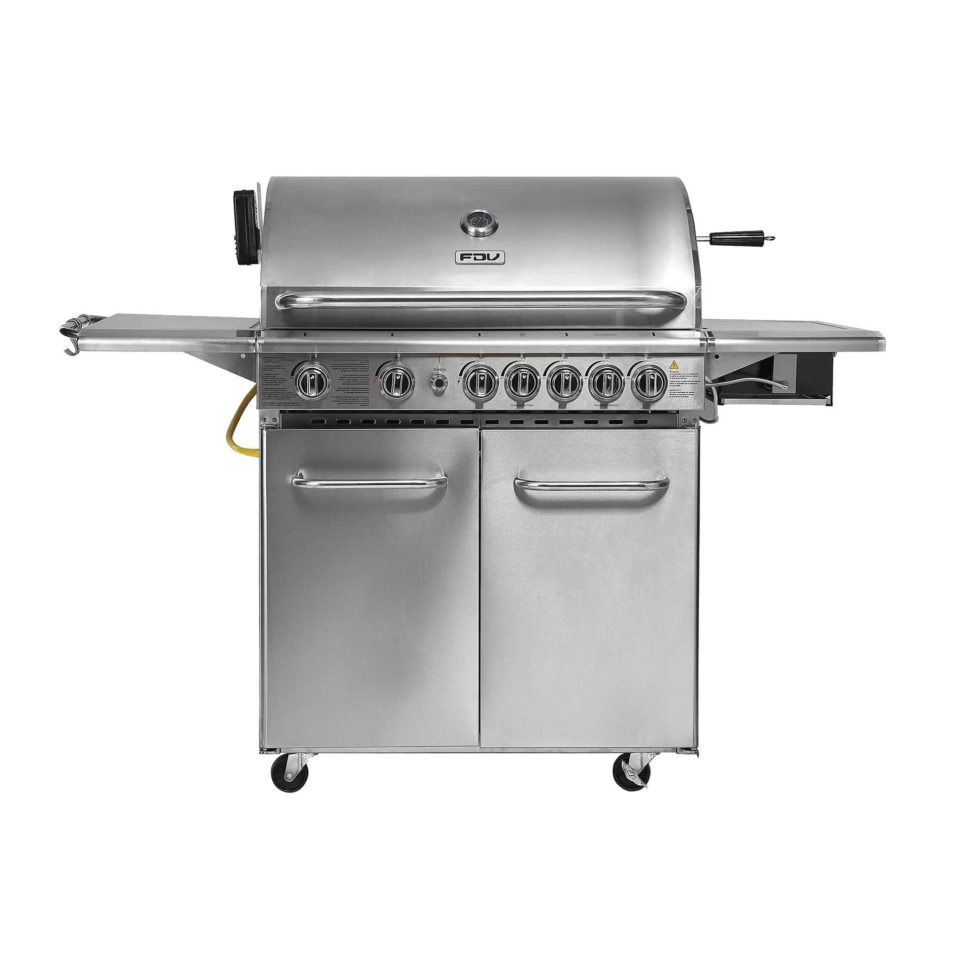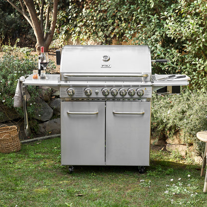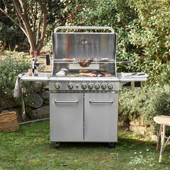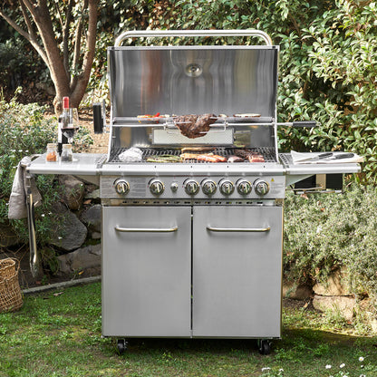Descubre la versatilidad de la Parrilla de Acero Inoxidable Smart 7Q FDV, diseñada con ruedas para llevar tus asados a donde desees. Equipada con 7 quemadores, encendido eléctrico, termostato de temperatura, 2 parrillas independientes, 1 parrilla pequeña superior y 2 bandejas laterales abatibles. Esta parrilla a gas incluye accesorios como regulador, spiedo con motor y funda protectora.