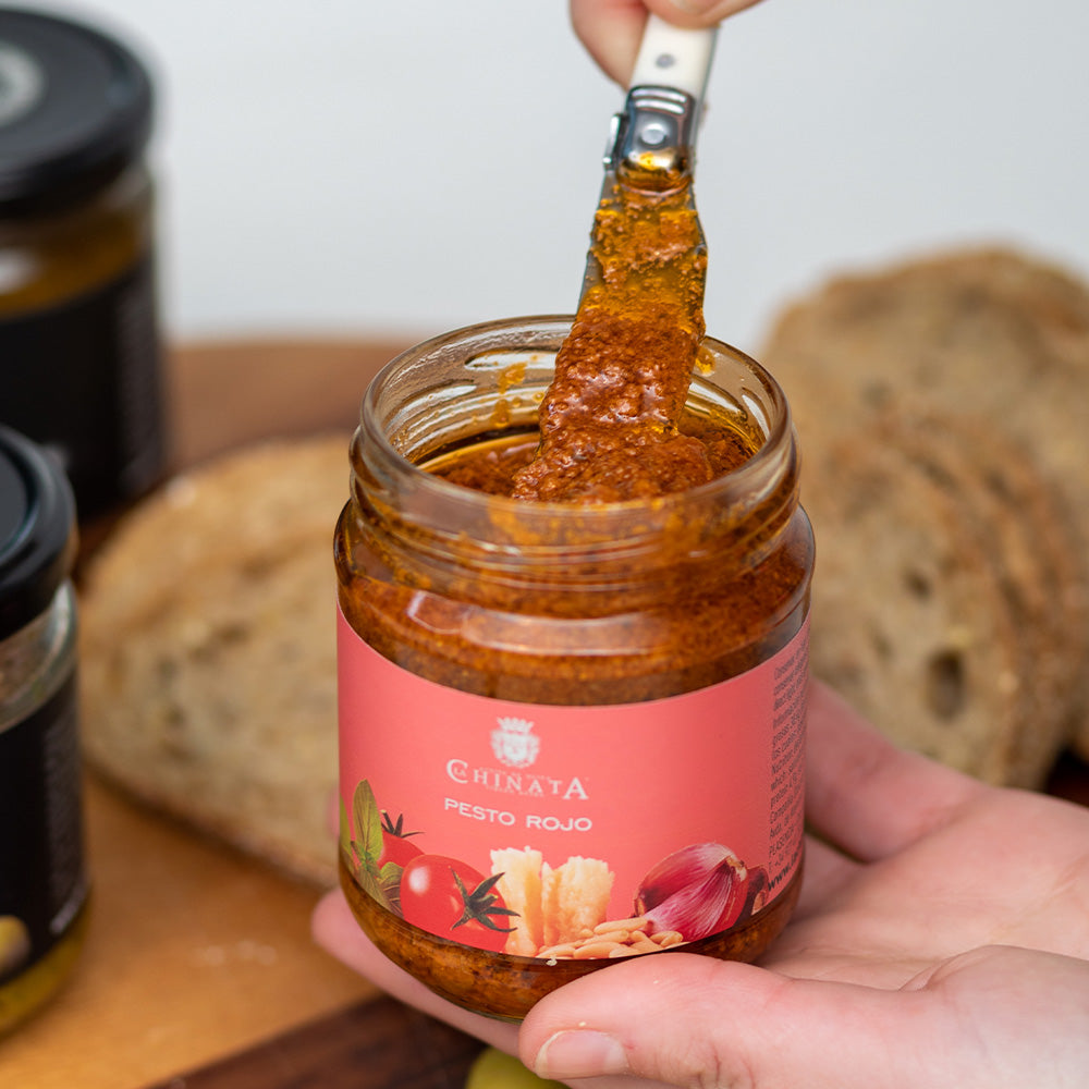 El Pesto Rojo 180 g La Chinata es una salsa gourmet que combina tomate seco y fresco, almendras, queso Grana Padano, albahaca, piñones, ajo, un toque de chilli y aceite de oliva virgen extra. Su sabor intenso y equilibrado es una alternativa vibrante al pesto clásico. Ideal para pastas, carnes, verduras, tostas, empanadas o como dip con crostinis. También combina a la perfección con burrata, ricotta o queso de cabra, y puede mezclarse con aceite para preparar vinagretas llenas de carácter.