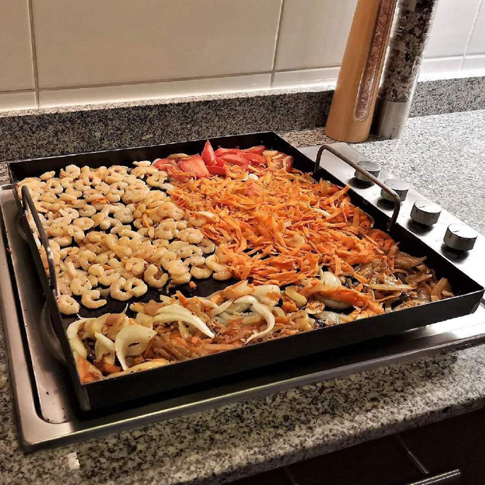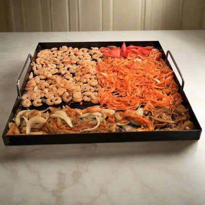 La Plancha Churrasquera 40x40 cm KasChile, es una plancha de acero resistente para cocinar carnes, pescados, sándwiches, freir huevos y saltear verduras, que logrará que tus preparaciones queden como en un restaurante! Se puede utilizar sobre parrilla, cocina, fogón y brasero. La plancha churrasquera está fabricada 100% en acero con superficie lisa, permitiendo distribuir el calor uniforme, generando una cocción rápida y homogénea de los alimentos. Está hecha de 1 pieza (bordes plegados) lo que permite no perder el jugo de alimentos. Tamaño 40x40 cm, cubre 4 quemadores de cocina