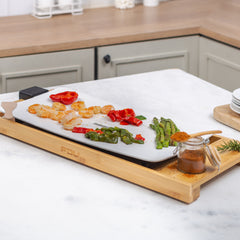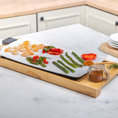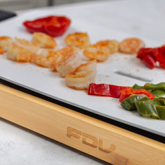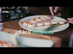 Te presentamos nuestra plancha Teppanwood de FDV, con una preciosa base de madera de bambú, una amplia superficie de ceramica y calor hasta los 210°C. Cocina verduras, carnes de manera saludable en su plancha completamente antiadherente que además cuenta con un deposito de grasa en el centro. Las piezas de la Tepanwood son desmontables por lo que también será un agrado lavarla.