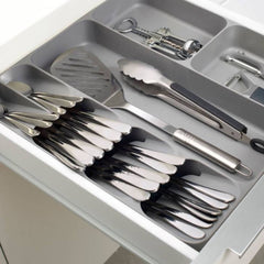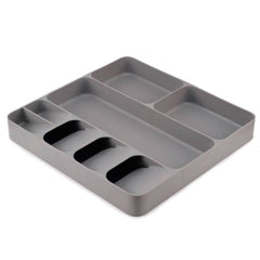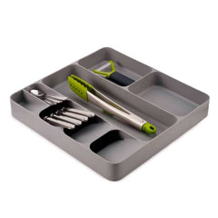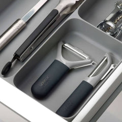 El Porta Cubiertos Gris Joseph Joseph tiene un novedoso diseño escalonado que te permite guardar más cosas en menos espacio. Tiene 4 compartimientos escalonados para tus cubiertos, 1 compartimiento grande para utensilios de cocina como tenazas y espátulas, y 2 compartimientos medianos para peladores, sacacorchos, etc