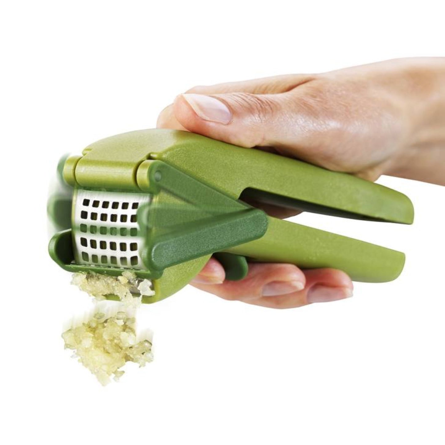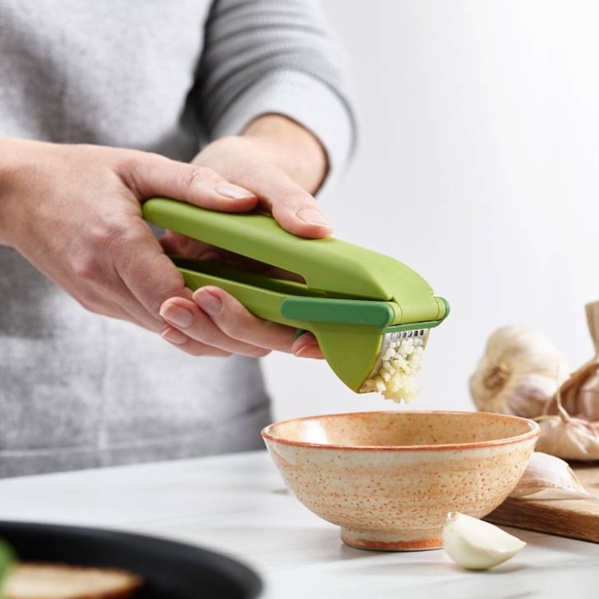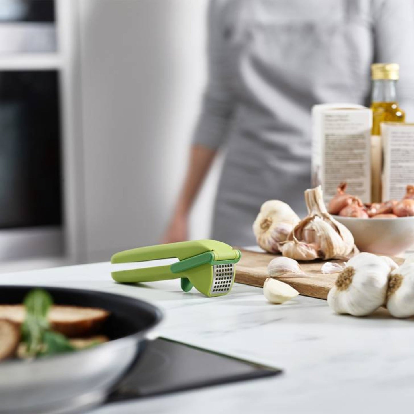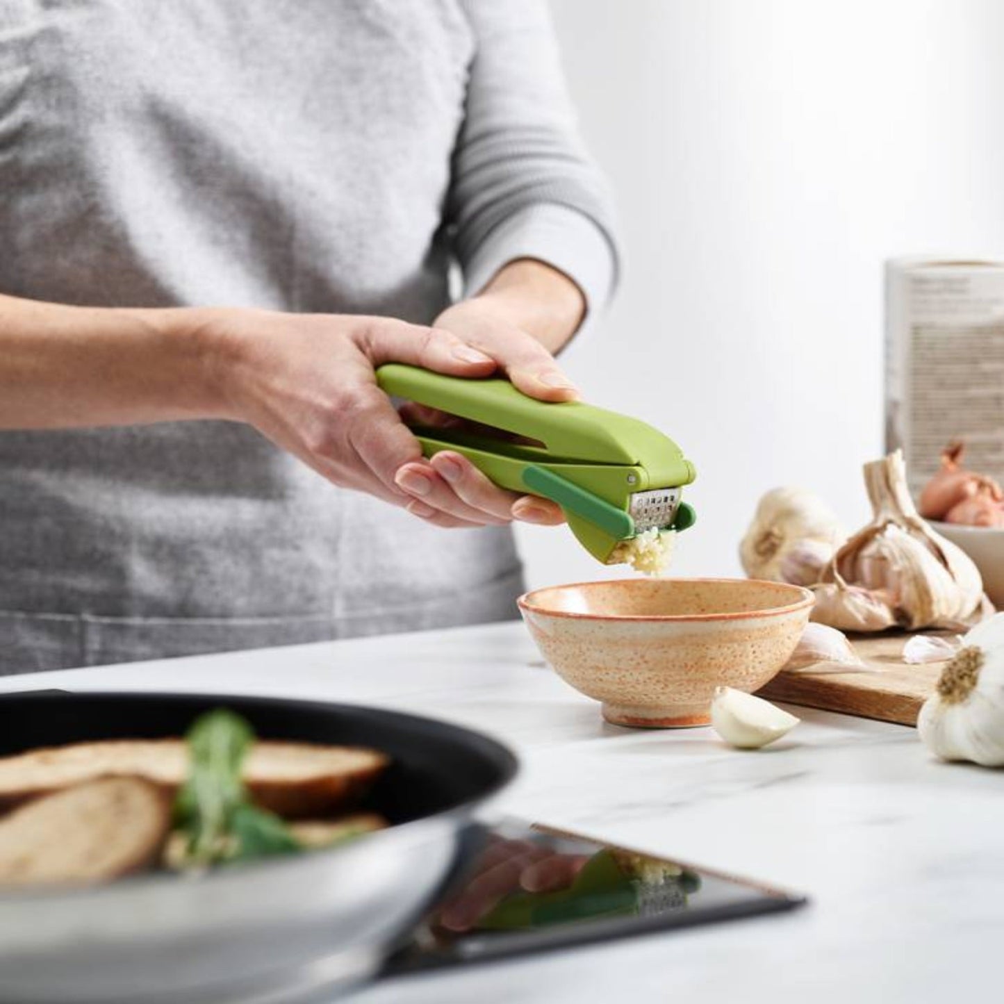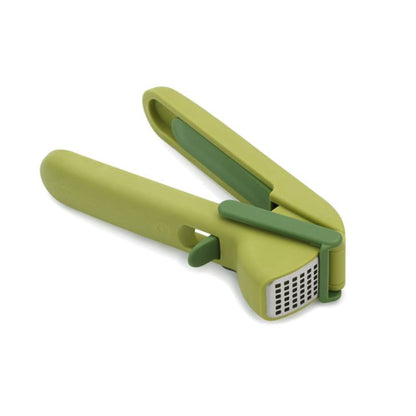 La Prensa Ajo Duo de Joseph Joseph tiene una cabeza con agujeros y una placa metálica para presionar los ajos de manera fácil y segura. Simplemente introduce un diente de ajo, aprieta la prensa y obtendrás ajo triturado para tus preparaciones. La placa metálica de acero inoxidable se remueve para facilitar su limpieza.