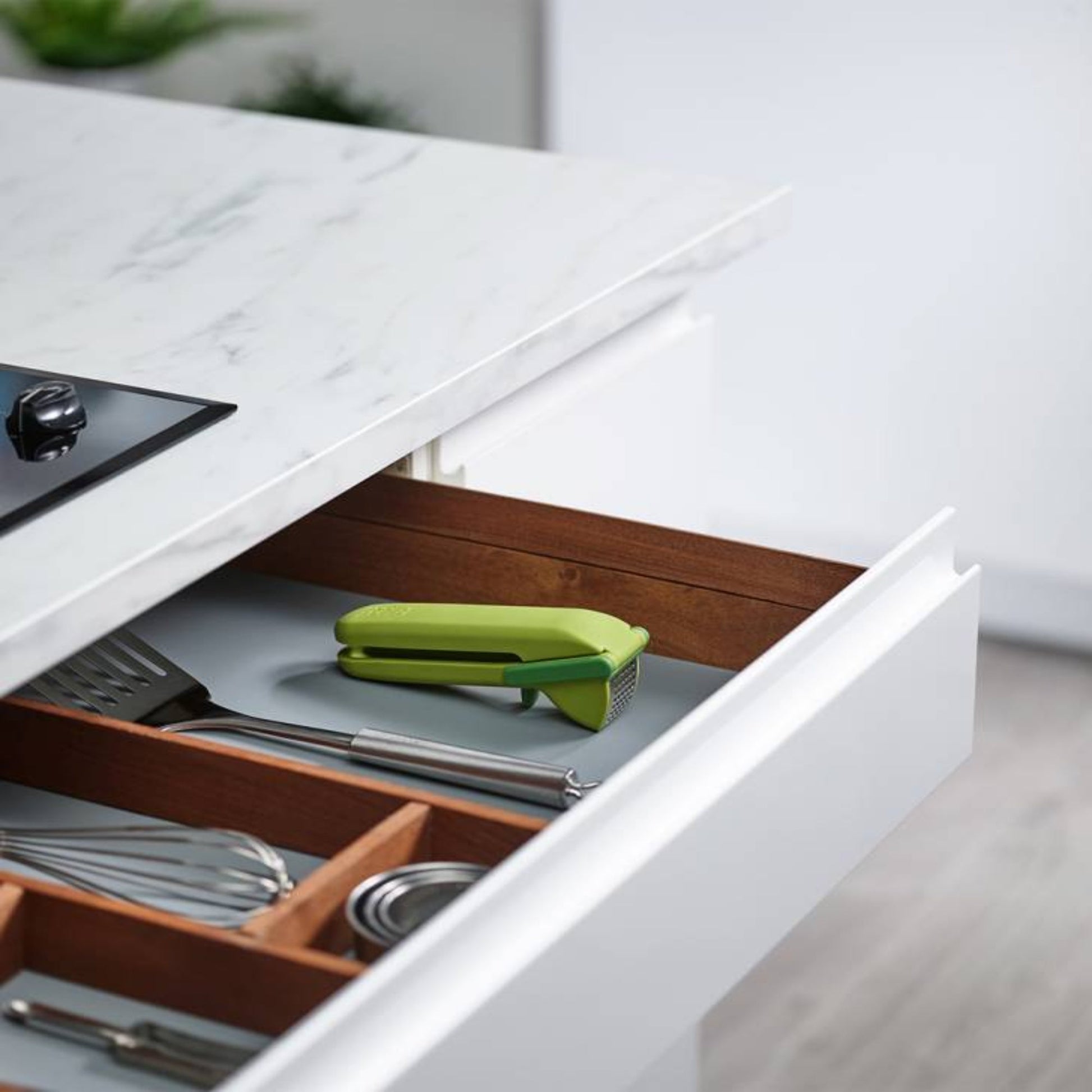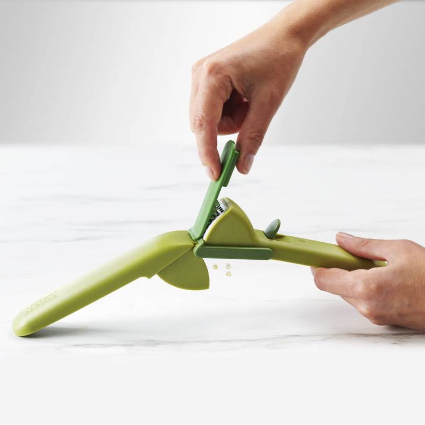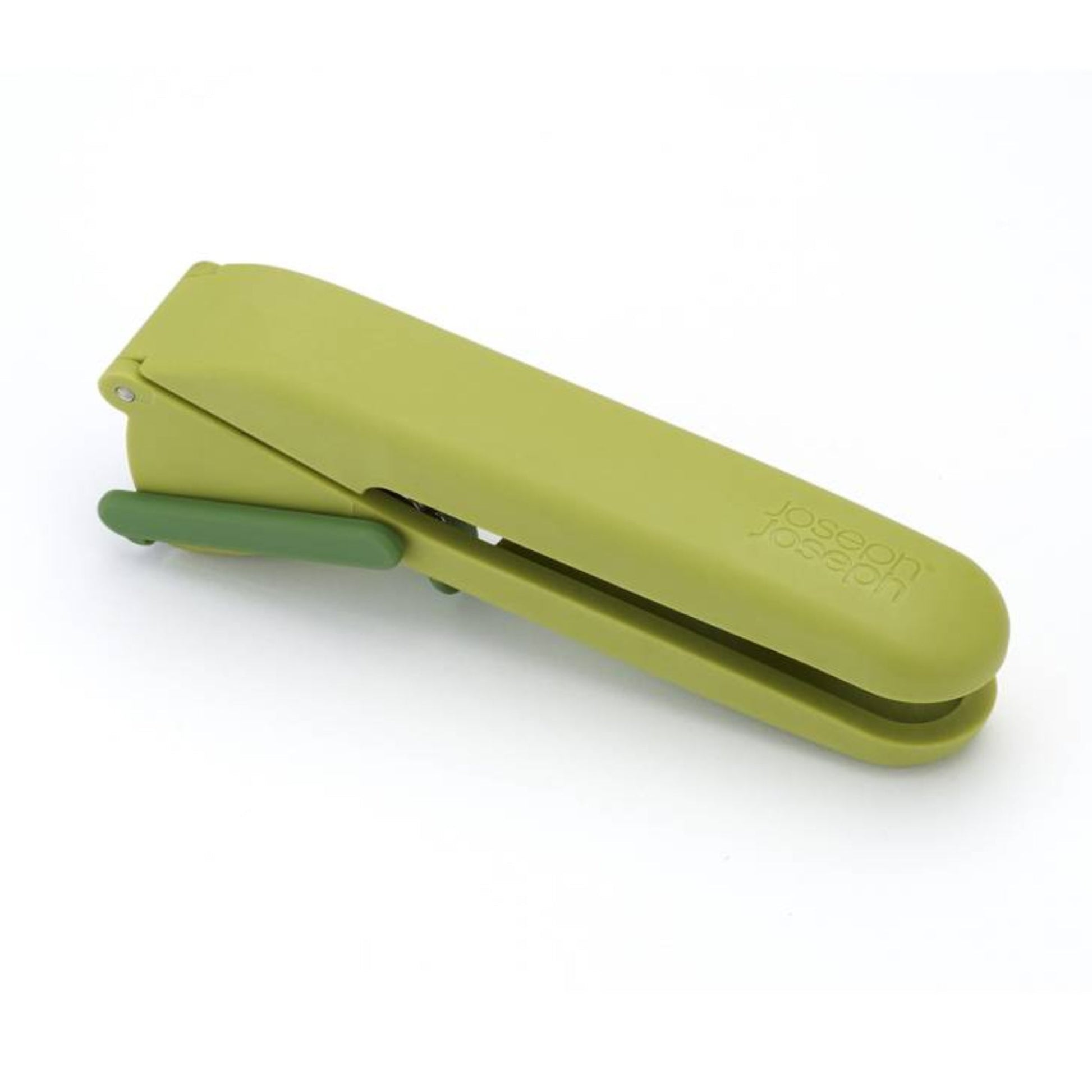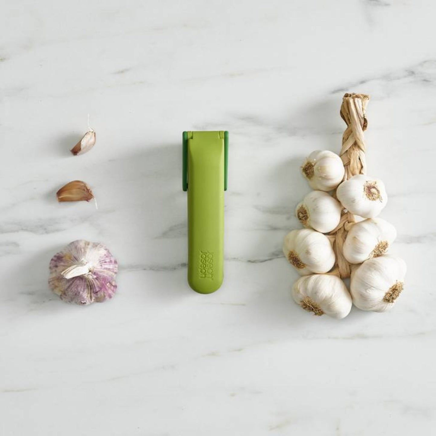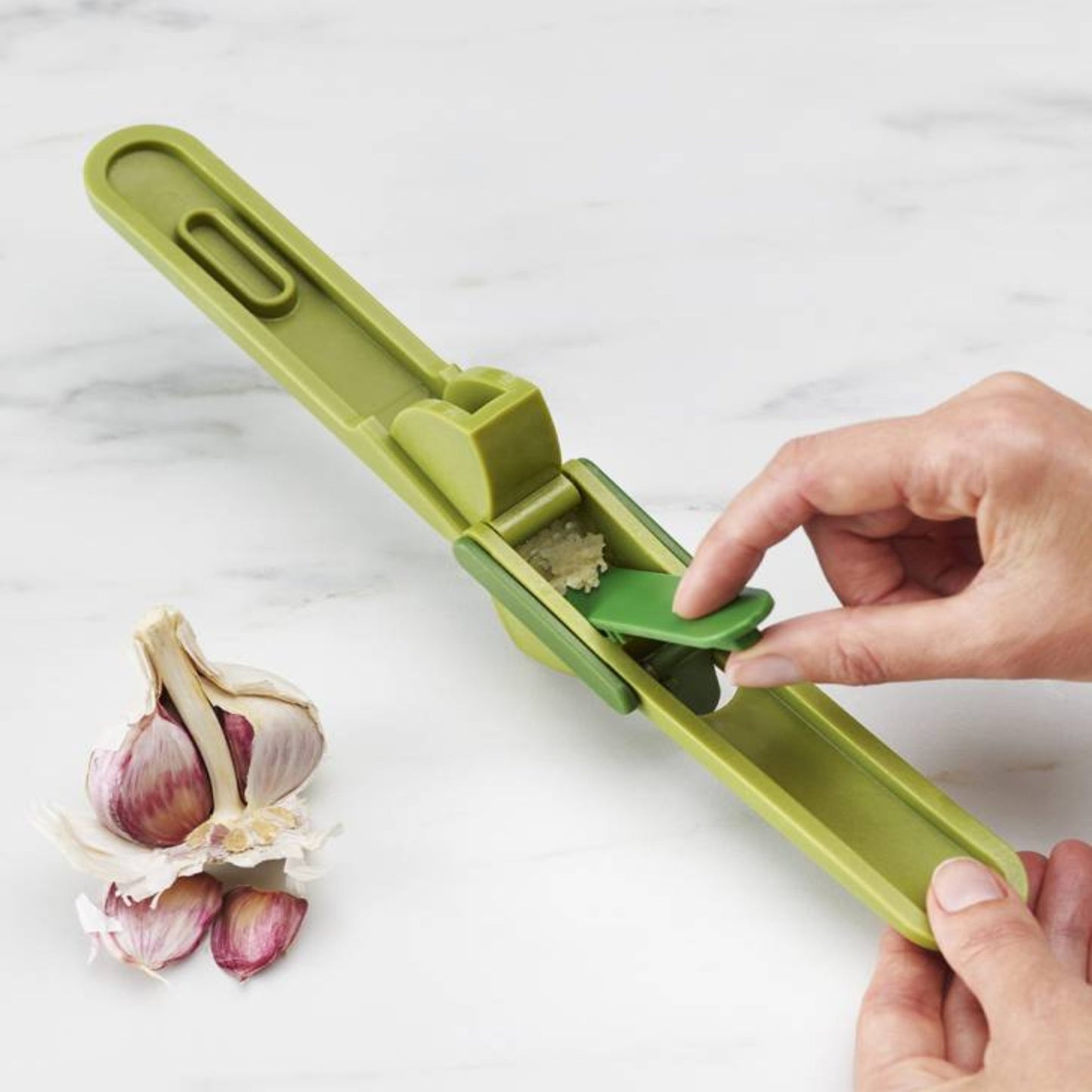 La Prensa Ajo Duo de Joseph Joseph tiene una cabeza con agujeros y una placa metálica para presionar los ajos de manera fácil y segura. Simplemente introduce un diente de ajo, aprieta la prensa y obtendrás ajo triturado para tus preparaciones. La placa metálica de acero inoxidable se remueve para facilitar su limpieza.