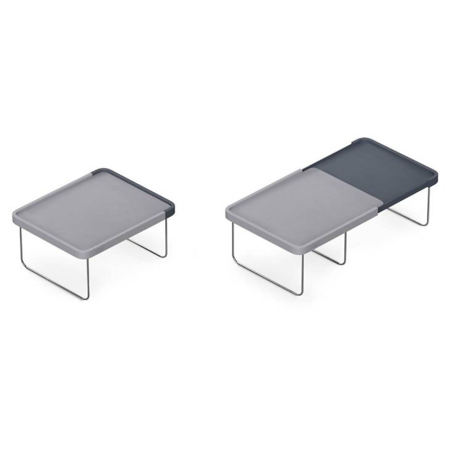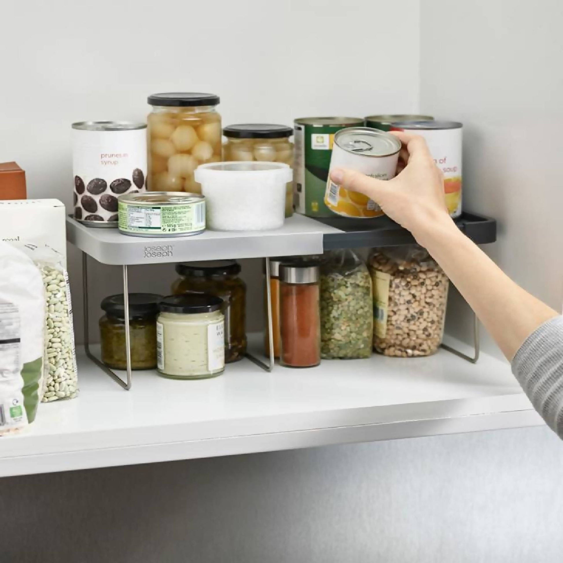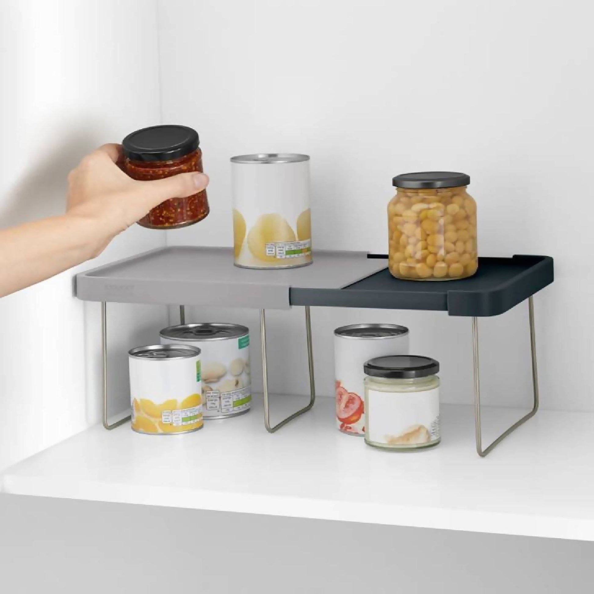 Con la Repisa Extensible Joseph Joseph podrás agregar espacio para guardar dentro de tu cocina. La repisa agregar un piso extra en tus muebles de cocina, duplicando el espacio de guardado para alimentos, platos, vasos o lo que necesites. Además, se extiende de 26cm a 46cm de largo, adaptándose al tamaño de tus muebles. Su superficie texturada y bordes altos evitan que los elementos que están arriba se deslicen. Por último, sus patas de acero inoxidable se abren y cierran fácilmente para armarlo.