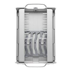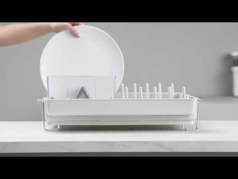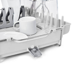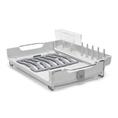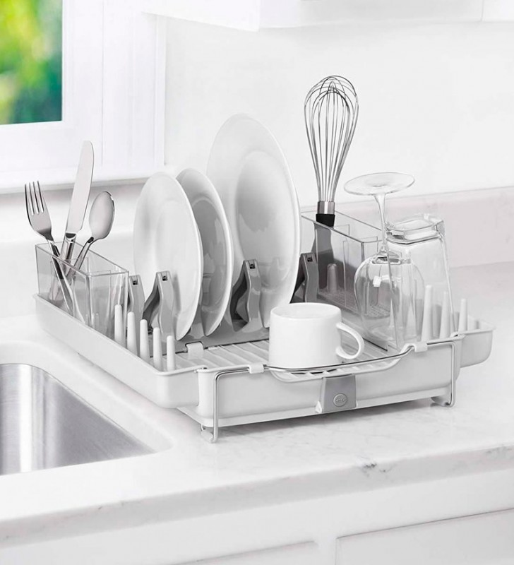 El Secaplatos Adaptable de Oxo se puede modificar para dar lugar a utensilios de mayor tamaño. Tiene divisiones especiales para secar individualmente platos, vasos y cubiertos. Además tiene un tapón de silicona para drenar el agua escurrida y bordes y patas plegables.