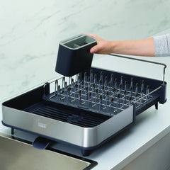 Maximiza la eficiencia en tu cocina con el Secaplatos Extensible Acero Inoxidable Joseph Joseph, una solución elegante y práctica para secar tu vajilla. Este secaplatos, con rejillas metálicas recubiertas, protege tus platos y copas mientras se secan. Al extenderlo, ofrece espacio adicional para vasos y bowls. Incluye un compartimento removible para cubiertos y utensilios, con un surco especial para cuchillos, y un riel elevado para secar tablas de cortar. Su diseño inteligente con boquilla integrada facilita el drenaje del agua directamente al lavaplatos. Además, todas sus piezas se separan, simplificando la limpieza. Este secaplatos no es solo un utensilio funcional, sino también un complemento elegante para toda cocina. Adquiere ahora tu Secaplatos y disfruta de la combinación perfecta de diseño, funcionalidad y practicidad.