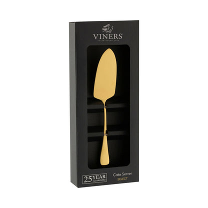 El servidor de torta Select de Viners dorado agregará estilo y sofisticación a cualquier entorno de té de la tarde. La forma sutil y delgada del mango en forma de lágrima está equilibrada por expertos, lo que es una delicia para sostener y mide 25 cm de longitud total. La cubertería está fabricada con acero inoxidable 18.0 de la mejor calidad, con un lujoso revestimiento de titanio dorado que agregará un elemento de opulencia a su mesa. El conjunto está empaquetado en una bella caja de regalo de lámina plateada y negra mate que agrega un toque extra de lujo y lo convierte en un regalo ideal. Viners ha existido durante más de 110 años y se ha convertido en una marca británica muy querida y un nombre familiar, impregnado de herencia.