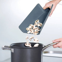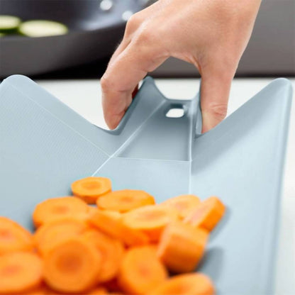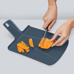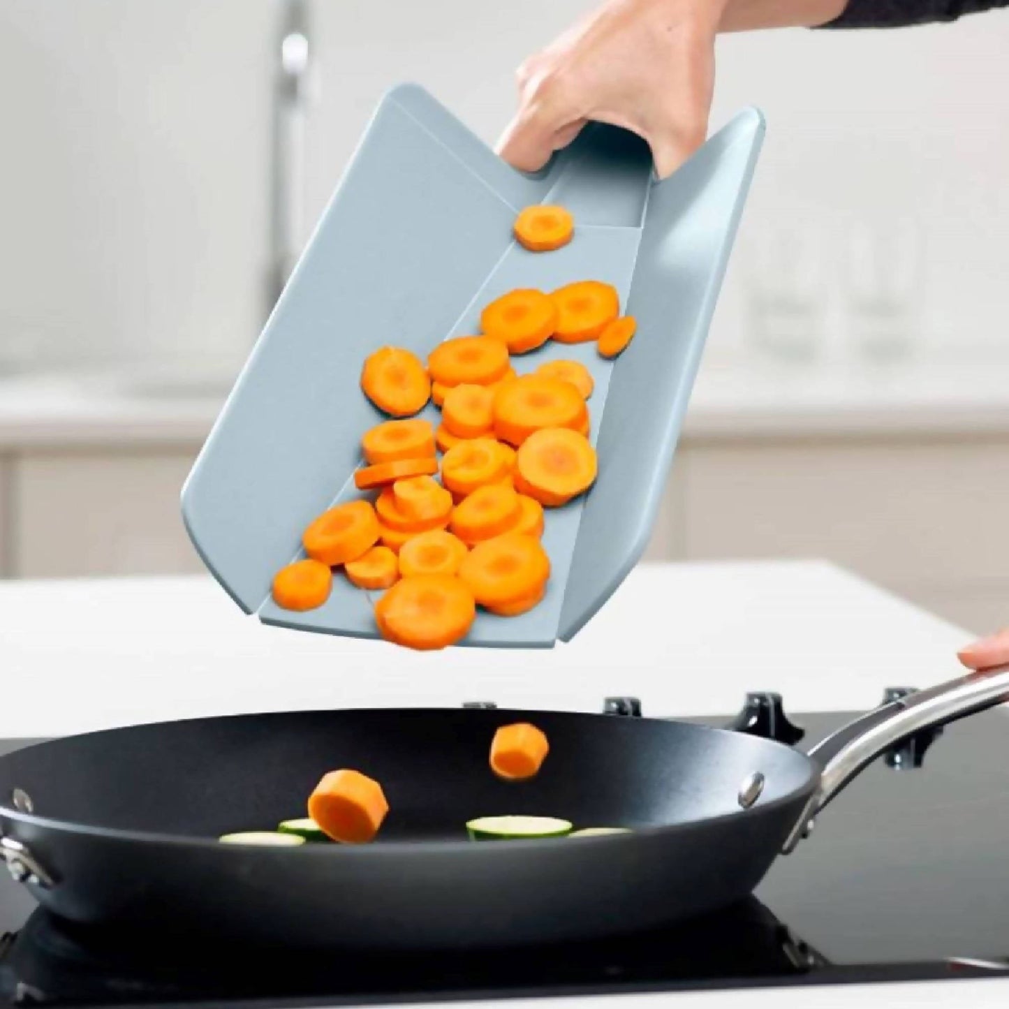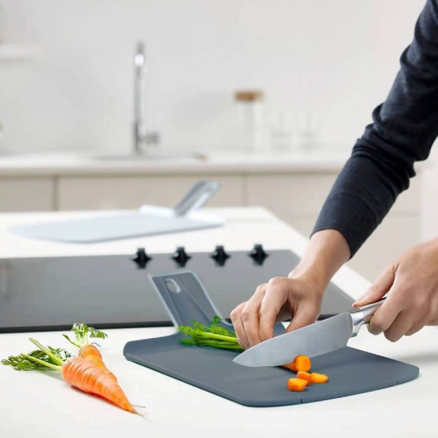 El Set 2 Tablas Plegables Azules Joseph Joseph incluye 2 tablas plegables en tonos azules con una superficie texturada que cuida el filo de tus cuchillos. Al apretar el mango, los lados de la tabla se doblan, creando un canal que facilita el vaciado de los ingredientes cortados directamente a la olla o sartén. Tiene topes antideslizantes para evitar que esta se mueva al cortar. Aptas para lavavajillas.