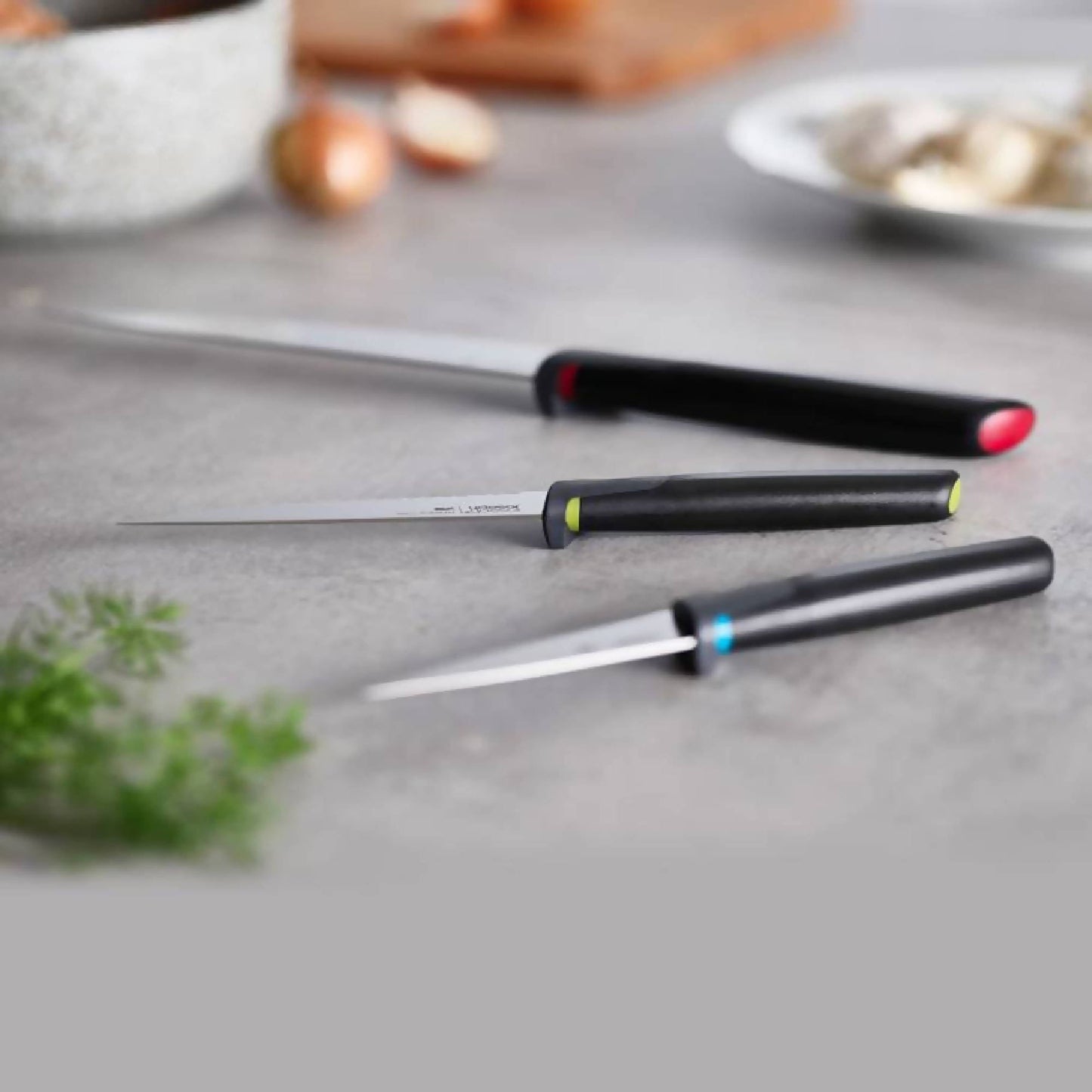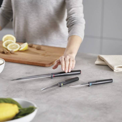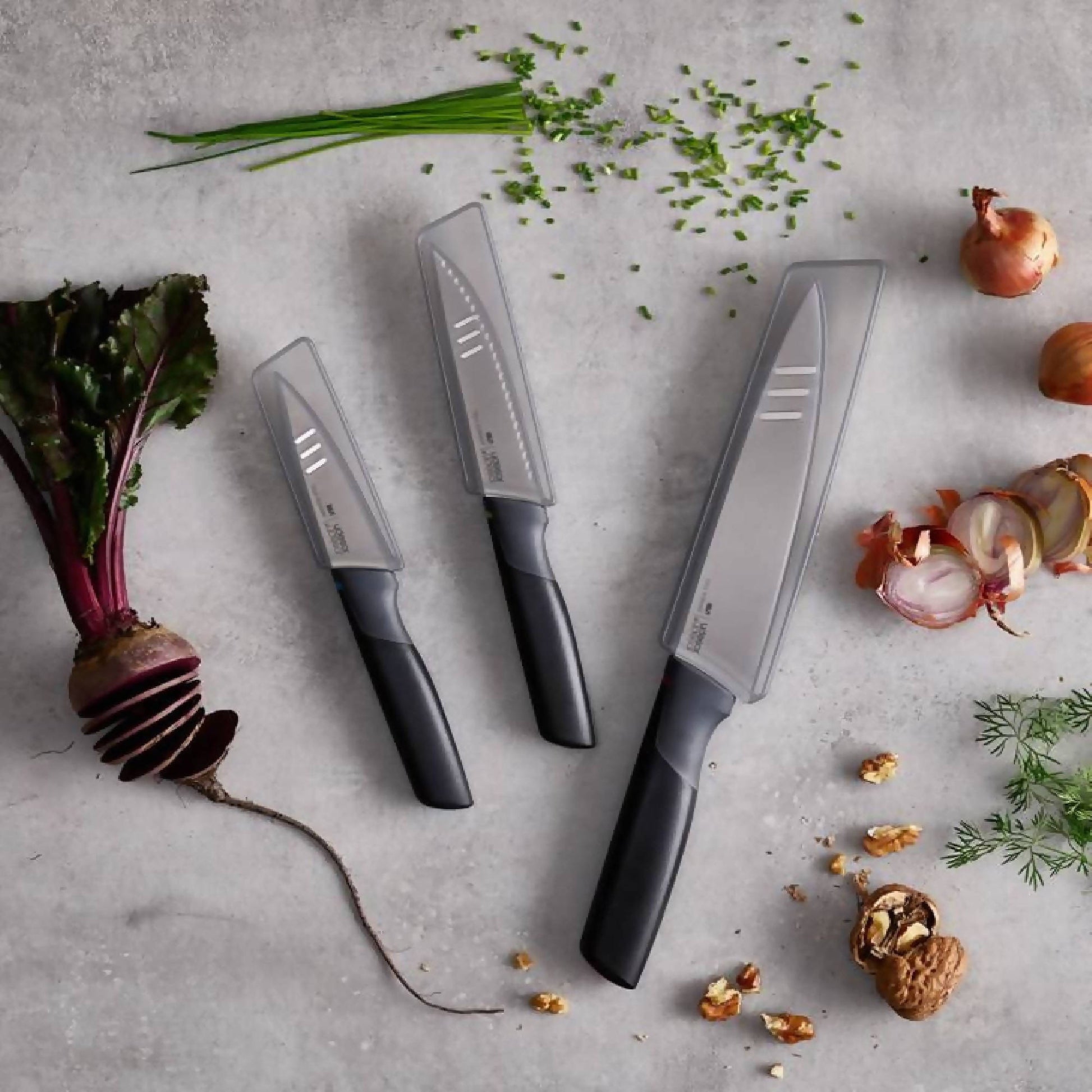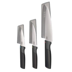 El Set De Cuchillos Elevate 3 Piezas de Joseph Joseph incluye los 3 cuchillos esenciales que necesitas en tu cocina para cortar, picar y rebanar. Los cuchillos tienen mangos ergonómicos, hojas de acero inoxidable japonés y una pieza especial en el mango para mantenerlos elevados al apoyarlos y que no ensucien el mesón. Además, cada cuchillo incluye una cubierta protectora para cubrir su filo cuando no están en uso.