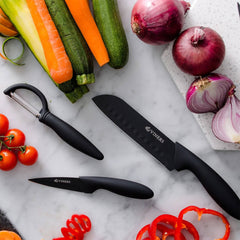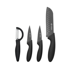 Este set de 4 piezas Viners Everyday es elegante y práctico para la preparación de comidas. Cuenta con 3 cuchillos y un pelado. Todos los elementos del set ofrecen mangos equilibrados por expertos que los hacen perfectos para una cocina hogareña ajetreada. Agregue ese cuchillo afilado y un pelador a los utensilios de preparación de la cena. El juego incluye 2 cuchillos para pelar de 9 cms, 1 cuchillo santoku de 12,5 cms y un pelador recto. Los cuchillos están hechos de acero inoxidable antiadherente de alta calidad con mangos suaves al tacto diseñados ergonómicamente para una máxima comodidad y agarre. El juego viene en un moderno color negro y es duradero. Lavar a mano únicamente. Viners existe desde hace más de 110 años y se ha convertido en una marca británica muy querida y un nombre familiar, impregnado de herencia.