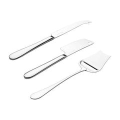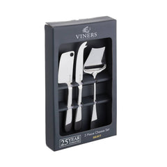 El juego de cuchillos para queso Viners Select de 3 piezas incluye todos los cuchillos necesarios para cortar y servir sus quesos favoritos. Este juego incluye 1 cuchillo para queso con puntas, 1 cuchillo para queso duro y 1 cuchillo para cortar queso. El cuchillo para queso con puntas es perfecto para cortar quesos más blandos con la hoja afilada que permite cortarlos fácilmente. La punta en forma de 'V' le permite servir su queso precortado a los invitados. El cuchillo para queso duro tiene una hoja pesada, resistente y afilada que corta los quesos más duros con facilidad. El cuchillo para cortar queso se utiliza para cortar quesos semiduros y duros para crear rodajas finas y uniformes. Los cubiertos están hechos de acero inoxidable de la mejor calidad y pulidos con un acabado de espejo.