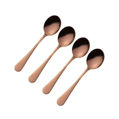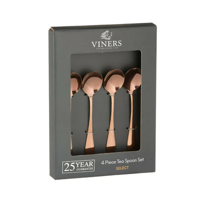 Este set de 4 cucharas de té es envidiablemente elegante y perfecto para el té de la tarde o uso diario. Tienen una forma de cuenco moderna combinada con una forma sutil y delgada de mango en forma de lágrima, revestida de cobre y que está equilibrada por expertos y es un placer para sostener La colección Select explora el método único de agregar colores vibrantes al acero inoxidable usando un recubrimiento de titanio. El set incluye 4 cucharas de té en una linda caja de regalo negra mate y plateada que le da un toque elegancia y calidad, lo que la convierte en un regalo ideal.