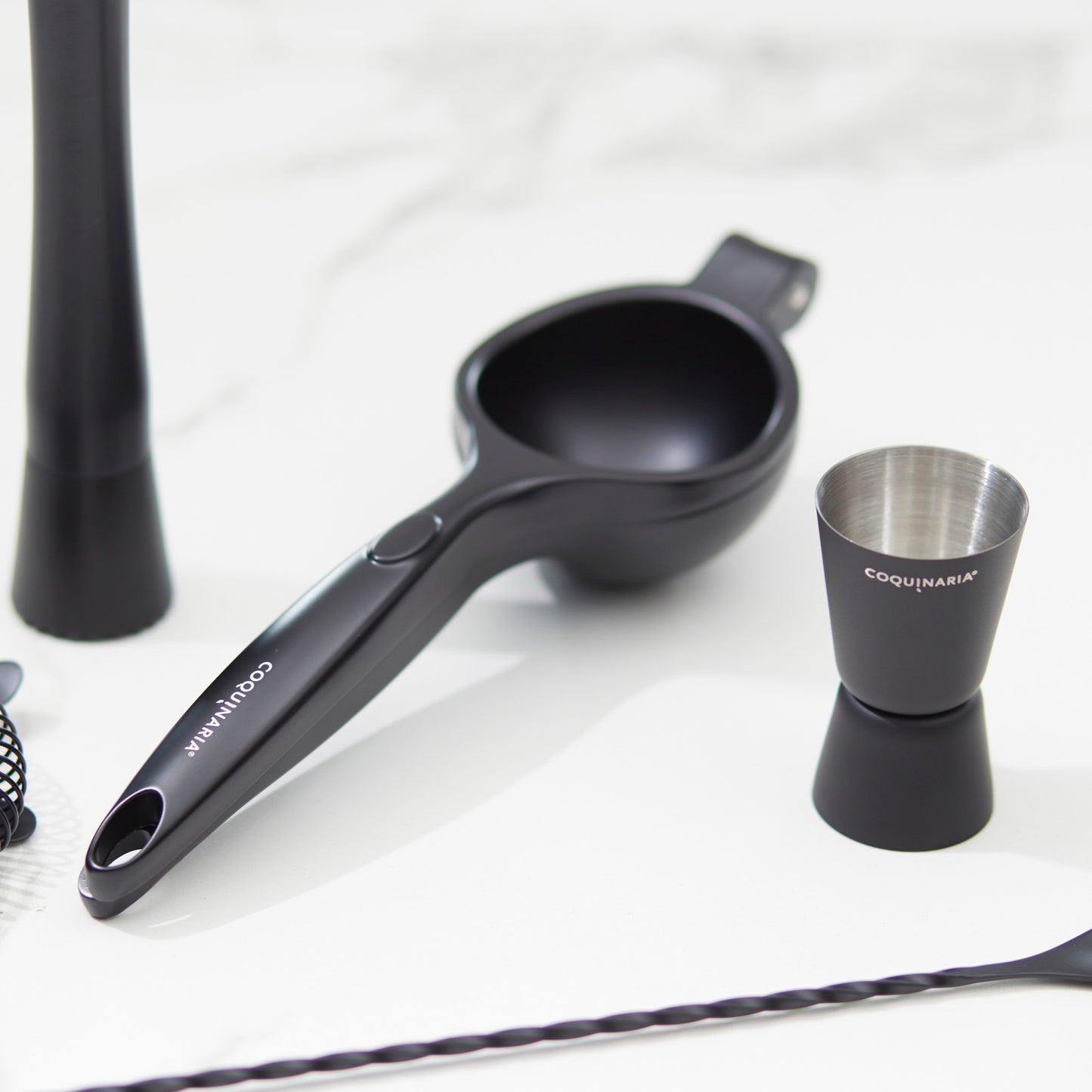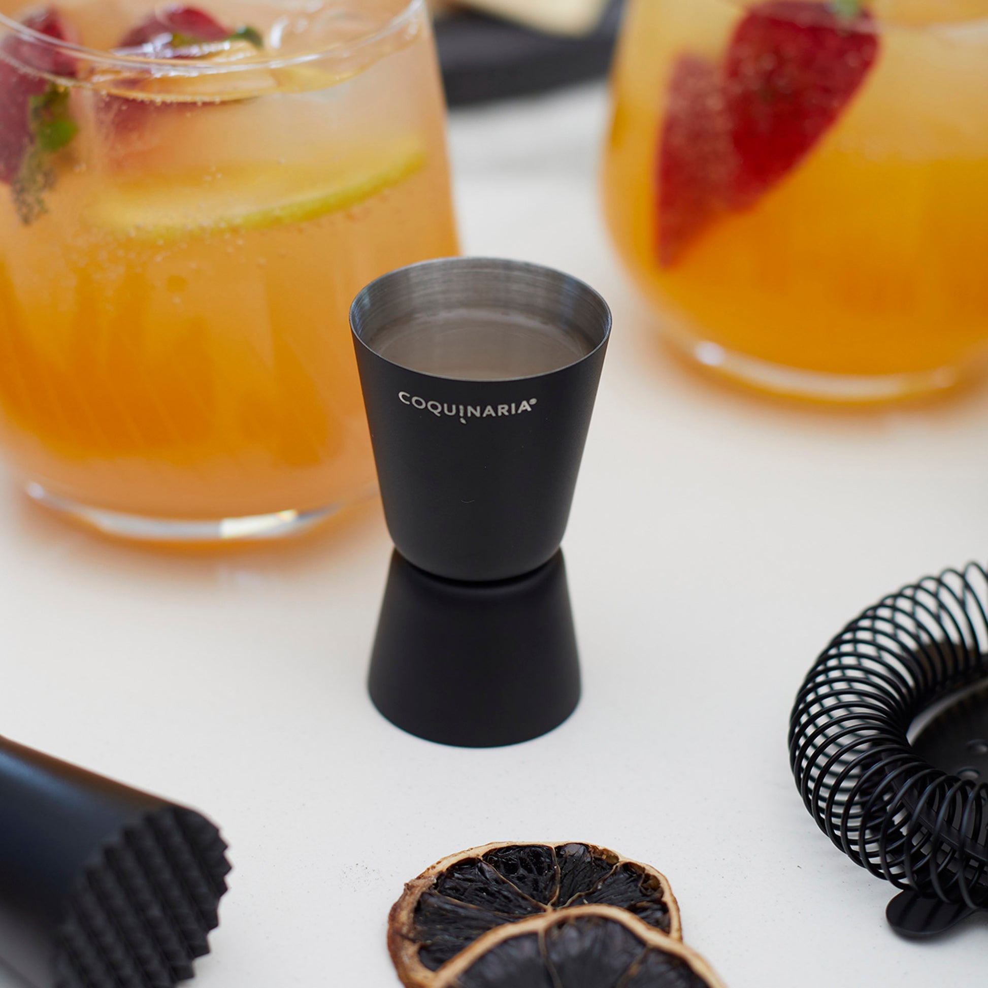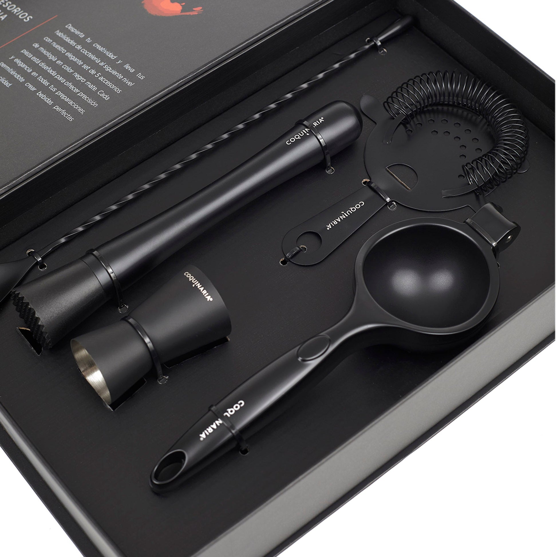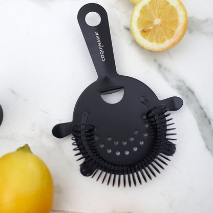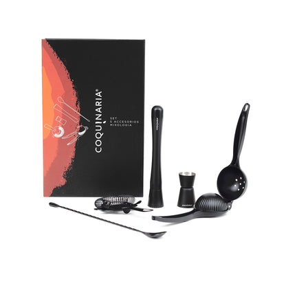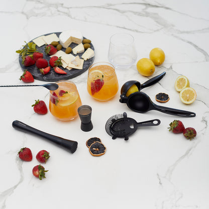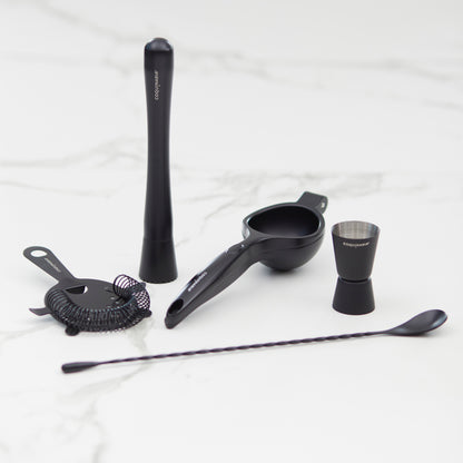 Este kit de herramientas esenciales para cóctel en acabado Matt Black combina funcionalidad y elegancia para quienes buscan perfeccionar cada preparación. Compuesto por un muddler de acero inoxidable, un medidor doble de 15/30 ml, un exprimidor de limón y un colador, ofrece precisión en cada paso, desde el equilibrio exacto en las medidas hasta la frescura de los ingredientes recién exprimidos. Su diseño en negro mate le da un toque moderno y sofisticado, ideal para crear bebidas con estilo profesional en casa. Perfecto para amantes de la coctelería, este set convierte cada mezcla en una experiencia refinada y memorable.