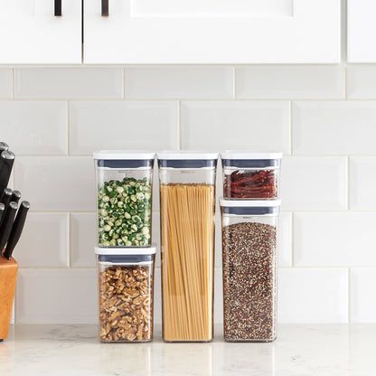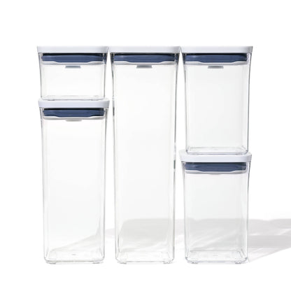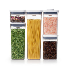 El Set de 5 Contenedores Pop Premium de Oxo incluye 5 contenedores con tapa y un sello de silicona que se cierra herméticamente al presionarla, manteniendo tus alimentos crujientes y frescos por más tiempo. Además, sus esquinas redondeadas sirven para verter los alimentos suavemente evitando derrames. Son perfectos para guardar alimentos secos tales como legumbres, arroz, cereales, tallarines y frutos secos y su tapa se desarma completamente para poder lavarla de manera más fácil (apto para lavavajillas). Los contenedores están diseñados para apilarse unos sobre otros por lo que son perfectos para optimizar el espacio en tu despensa y mantenerla organizada.