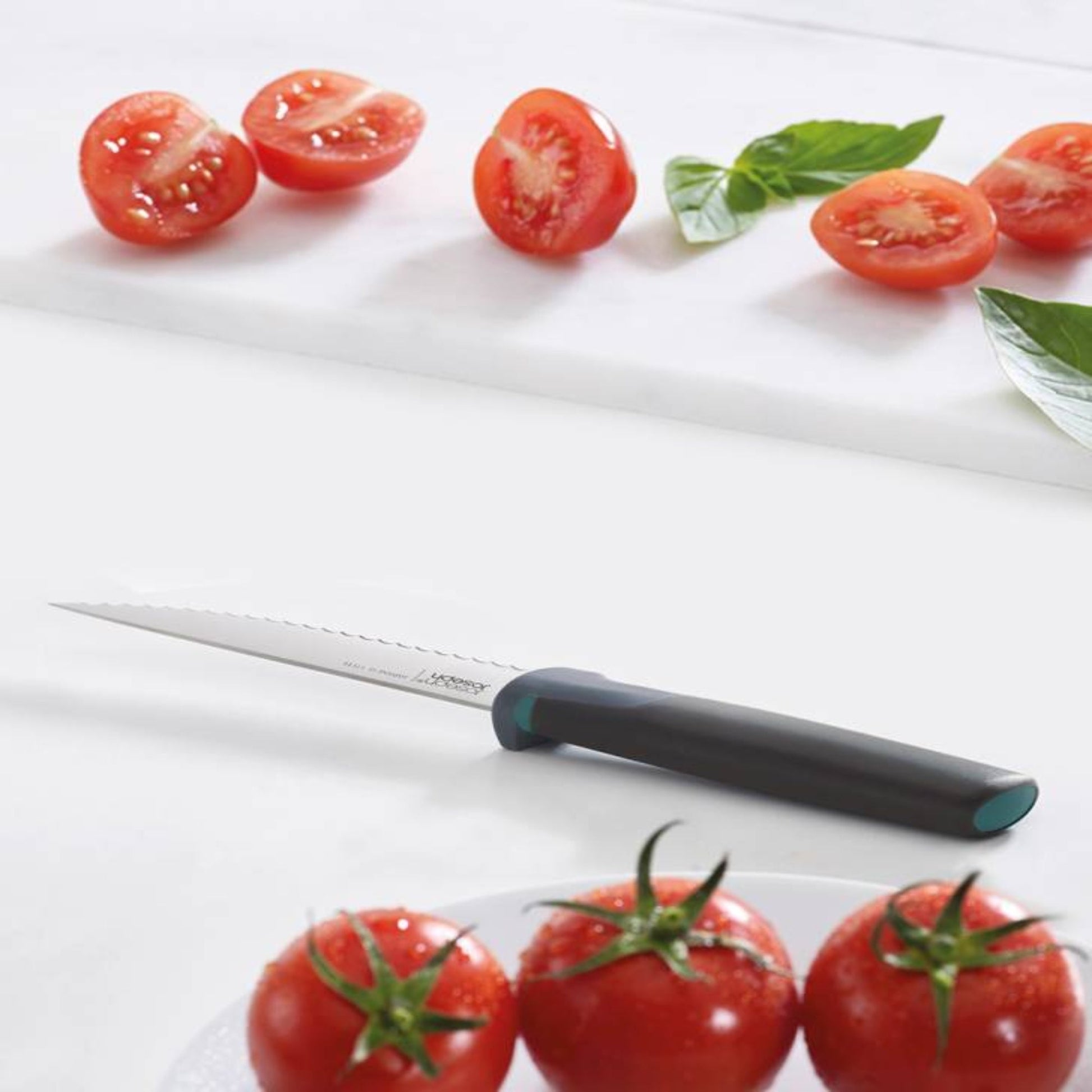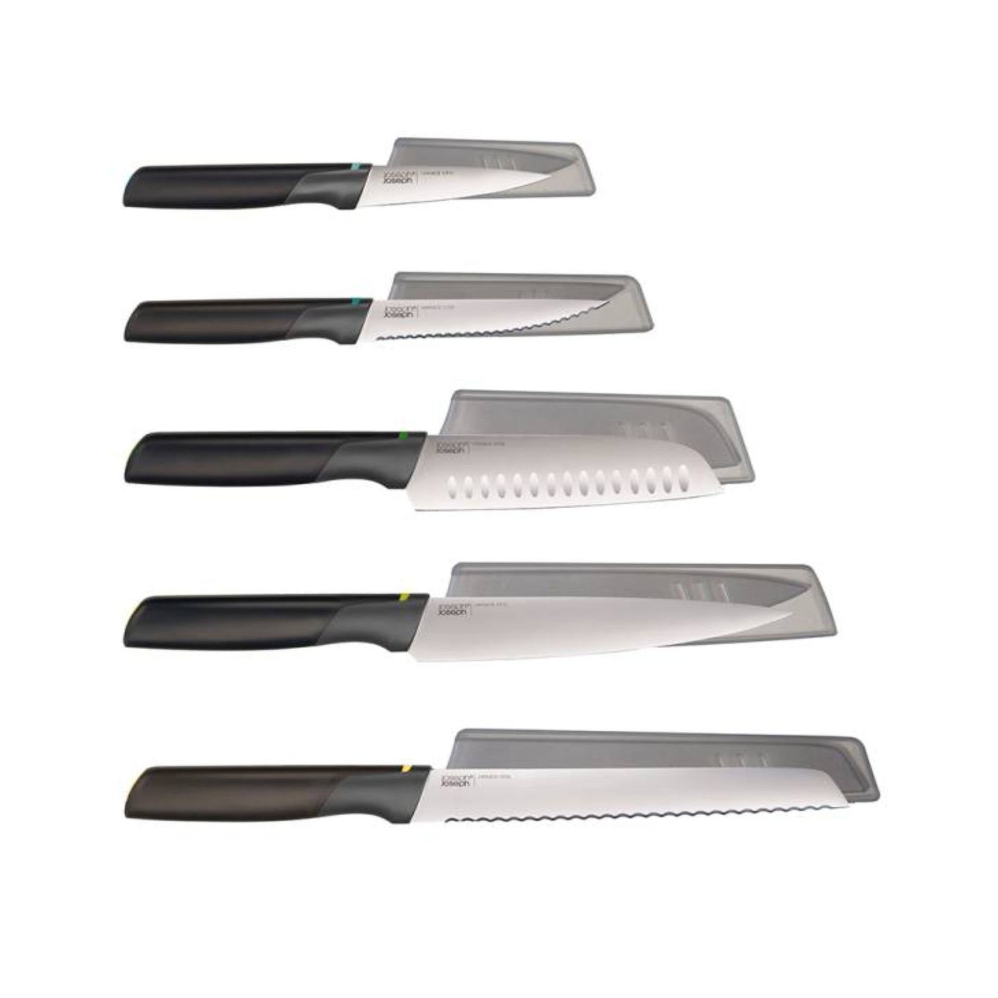 El set de cuchillos Duo de Joseph Joseph está diseñado con varias características destacadas.Tecnología Elevate: Diseñada para mejorar la higiene y minimizar el desorden. Esto permite que las cuchillas no toquen la superficie de trabajo cuando se colocan hacia abajo, gracias a los soportes integrados para cuchillos. Asas ergonómicas. Las asas están diseñadas ergonómicamente para proporcionar un agarre cómodo y seguro durante el uso.Fundas protectoras de almacenamiento: Incluye fundas protectoras para almacenar los cuchillos de forma segura cuando no están en uso, lo que ayuda a mantener las cuchillas en óptimas condiciones y evita accidentes.Este set contiene: Cuchillo Paring o Pelador (cuchilla 9cm), Cuchillo de sierra (cuchilla 11cm), Cuchillo de chef (cuchilla 16,5cm), Cuchillo de Pan (20 cm), Cuchillo Santoku (14cm)