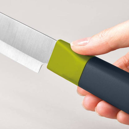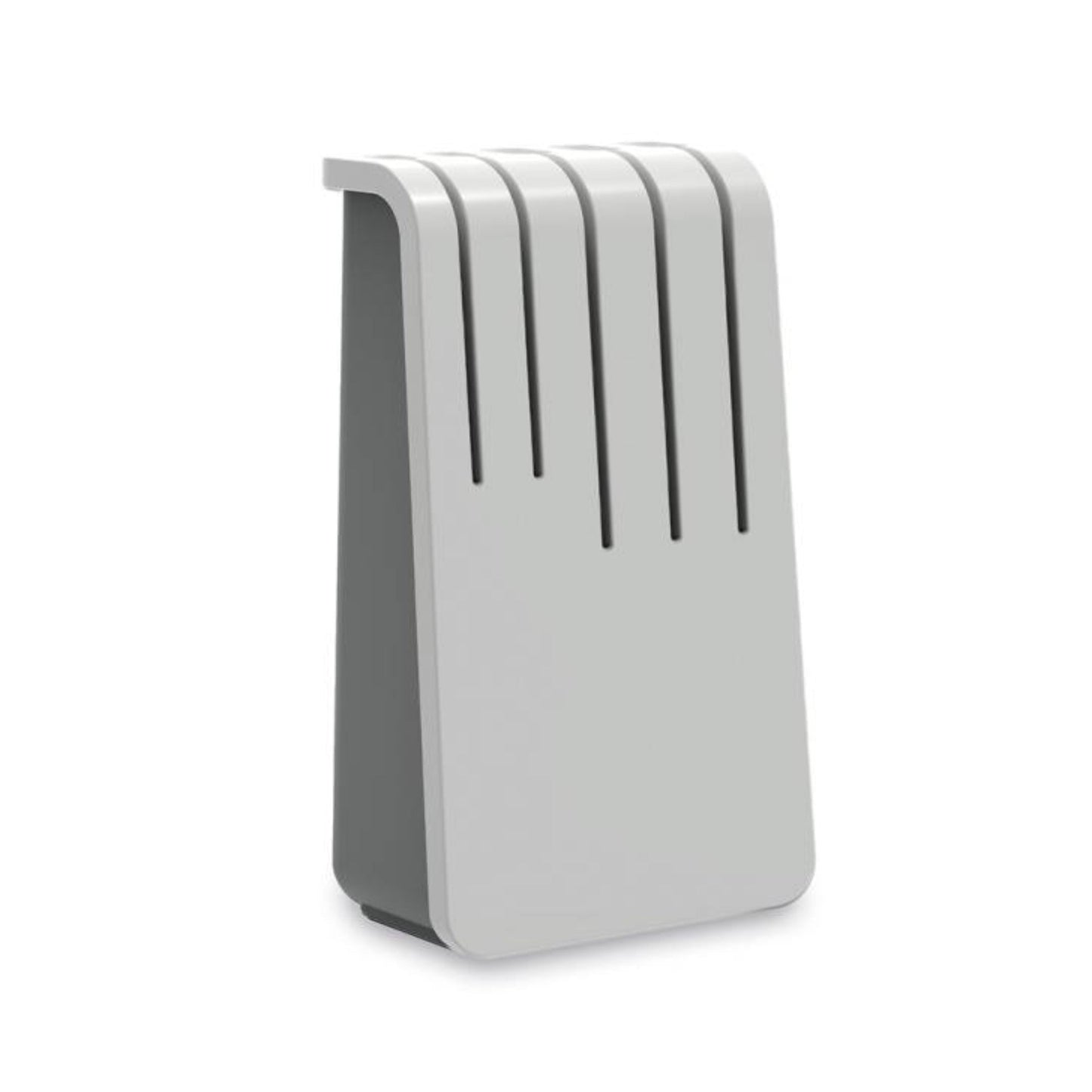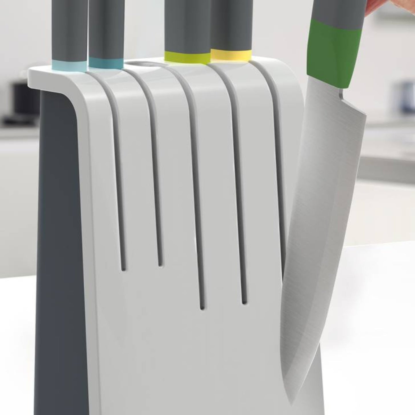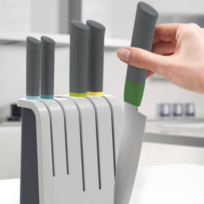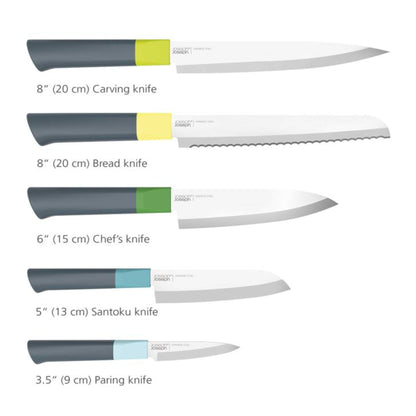 El Set 5 Cuchillos Con Base Duo Joseph Joseph es todo lo que necesitas en tu cocina para cortar, picar y pelar. El set incluye 5 cuchillos distintos para cortar carne, pollo, pescado, frutas, verduras y pan. Los cuchillos incluidos son: Paring 9cm, Santoku 13cm, Chef 15cm, Trinchar 20cm, Pan 20cm. Los cuchillos están hechos de acero inoxidable japonés y tienen un mango ergonómico de fácil agarre. Se guardan en una moderna y estilizada base antideslizante color gris que se verá muy bien sobre el mesón de tu cocina.