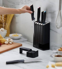 Los cuchillos están hechos de acero inoxidable japonés y tienen un mango ergonómico revestido de silicona con una pieza especial que permite apoyarlos en el mesón sin que este se ensucie. Se guardan en una moderna y estilizada base que incluye un afilador de 2 tiempos en su parte inferior, para que siempre tengas tus cuchillos afilados antes de usarlos. Con el estiloso Set 5 Cuchillos Elevate con el Afilador Joseph Joseph podrás cortar todo tipo de alimentos al cocinar y afilar tus cuchillos antes de usarlos. El set incluye 5 cuchillos distintos para cortar todo lo que necesites: carne, pollo, pescado, frutas, verduras y pan.