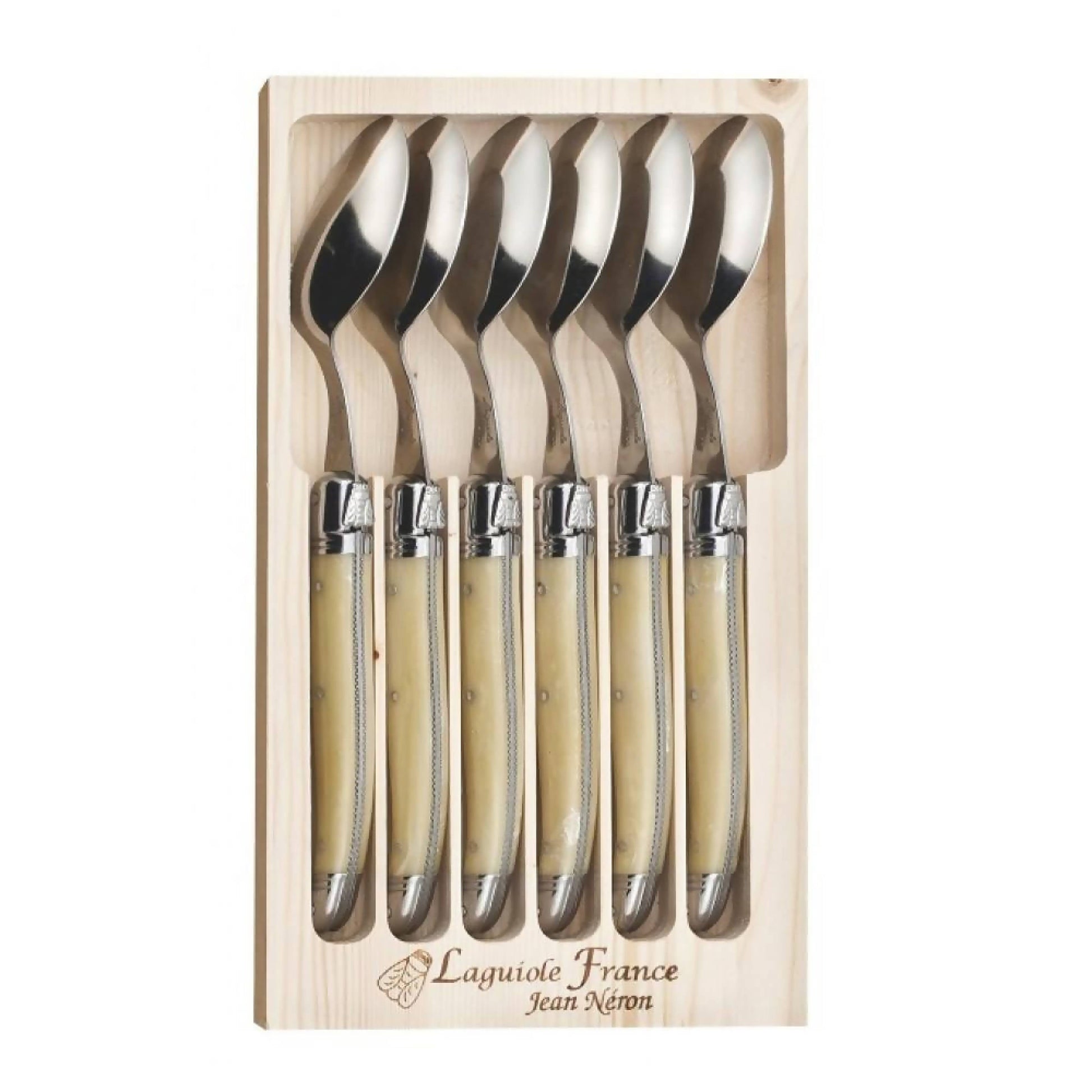 La fábrica JEAN NERON, es una empresa familiar con mas de 100 años de tradición en la elaboración de cuchillos de alta calidad. Provienen de la zona de Laguiole, Francia. Set 6 cucharas para té o café STAINLESS STEEL caja madera. Contiene su certificado de autenticidad por ser la mayoría de sus productos hechos a mano, esto también hace que al agarrar los cubiertos sea muy cómodo para la persona.