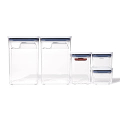 El Set de Contenedores Pop Premium para Repostería 8 Piezas de Oxo incluye 5 contenedores con tapa y un sello de silicona que se cierra herméticamente al presionarla, manteniendo tus alimentos crujientes y frescos por más tiempo. Además, sus esquinas redondeadas sirven para verter los alimentos suavemente evitando derrames. Son perfectos para guardar tus ingredientes de repostería tales como azúcar, harina, polvos de hornear, chips de chocolate, mostacillas, etc. Además, incluye 2 cucharas de 1/2 taza (120ml) para medir y servir tus ingredientes. Estas cucharas se enganchan en la parte inferior de la tapa de los contenedores.