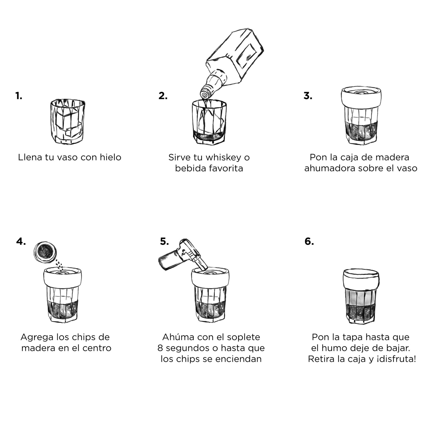 Sigue estos sencillos pasos con el Set Ahumador de Whisky Coquinaria para añadir un toque ahumado a tu bebida favorita. Llena tu vaso con hielo, sirve tu whisky y ahúmalo con chips de madera para una experiencia única de sabor y aroma.