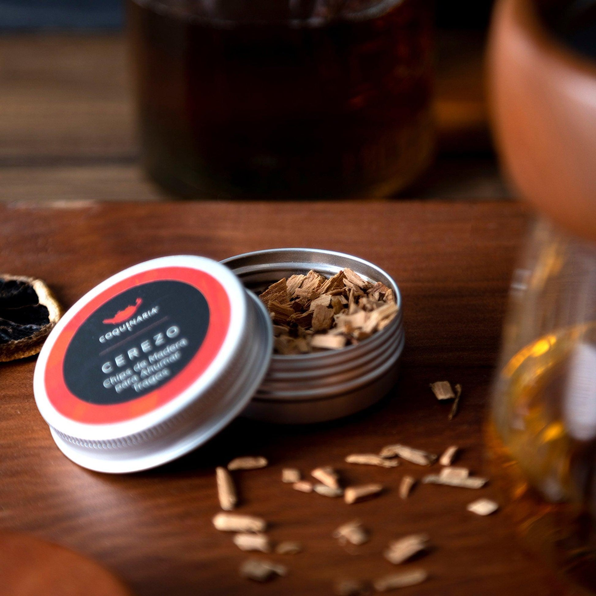 • Características Especiales Ideal para tragos con whisky, bourbon, pisco, ron, etc. Set Incluye 4 variedades de chips de madera para ahumar : Manzano, roble, cerezo y nogal, 1 Soplete para ahumar, caja de madera ahumadora.