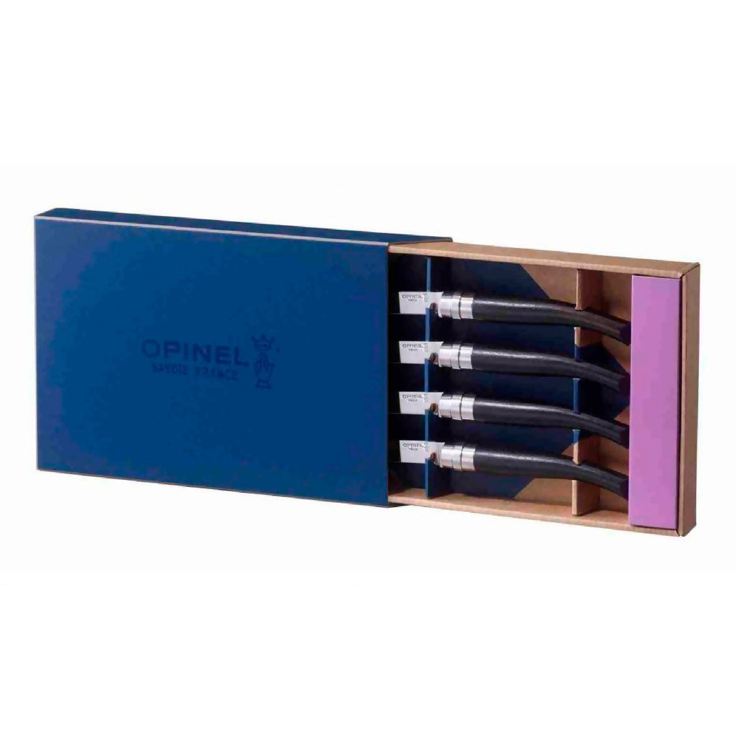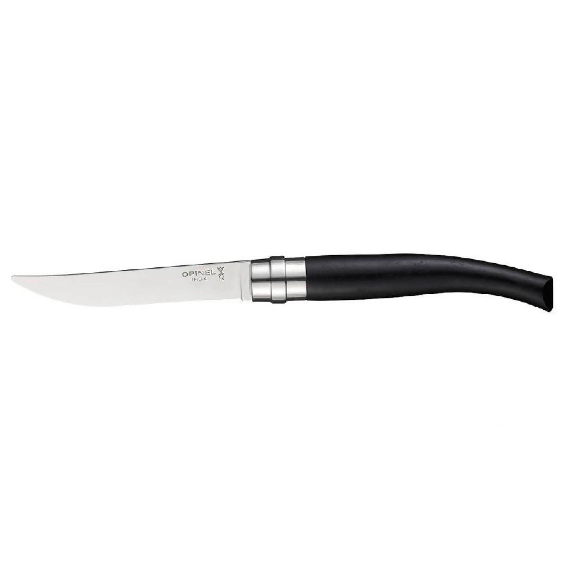 Acero inoxidable Sandvik El acero inoxidable 12C27 de Sandvik puesto a punto por Opinel es famoso por su corte y su facilidad de uso. El acero inoxidable es capaz de someterse al tratamiento térmico que le da su gran durabilidad y se denomina martensítico. Tiene una gran cantidad de carbono, al menos un 0,40 %, lo que permite conseguir un corte muy satisfactorio y ser sensible a la corrosión. La hoja tiene un acabado de poliglaseado, el doble pulido permite conseguir un efecto de espejo. Mango La madera de ébano es una madera escasa y de lujo, procedente de los bosques de África. El ébano tiene una bonita densidad y un color negro profundo y se utiliza tradicionalmente en ebanistería artística y en marquetería. La mitra de acero conlleva una parte plana en la parte trasera para que el cuchillo se mantenga estable en la mesa.
