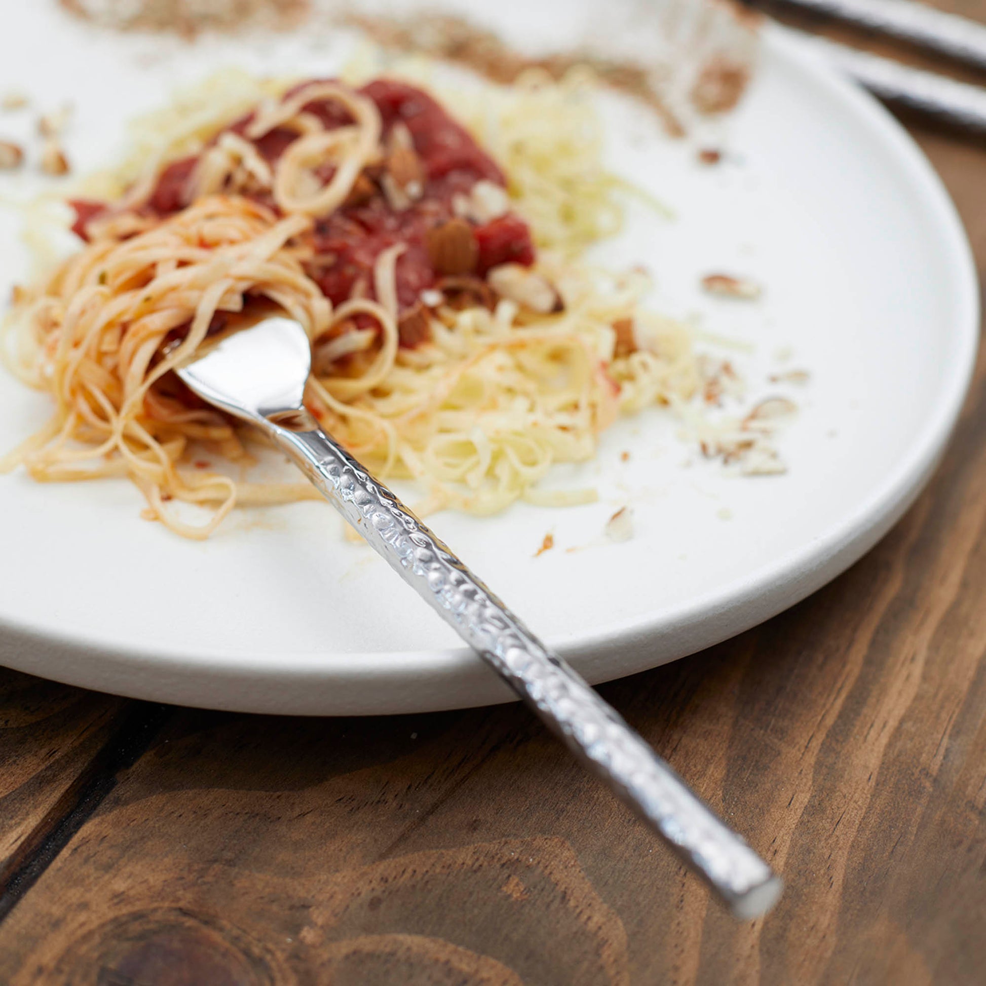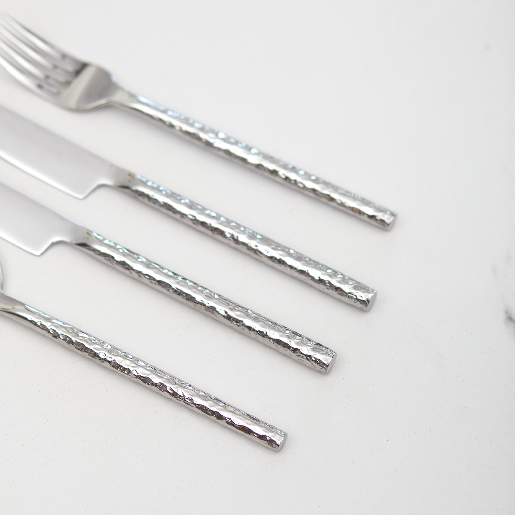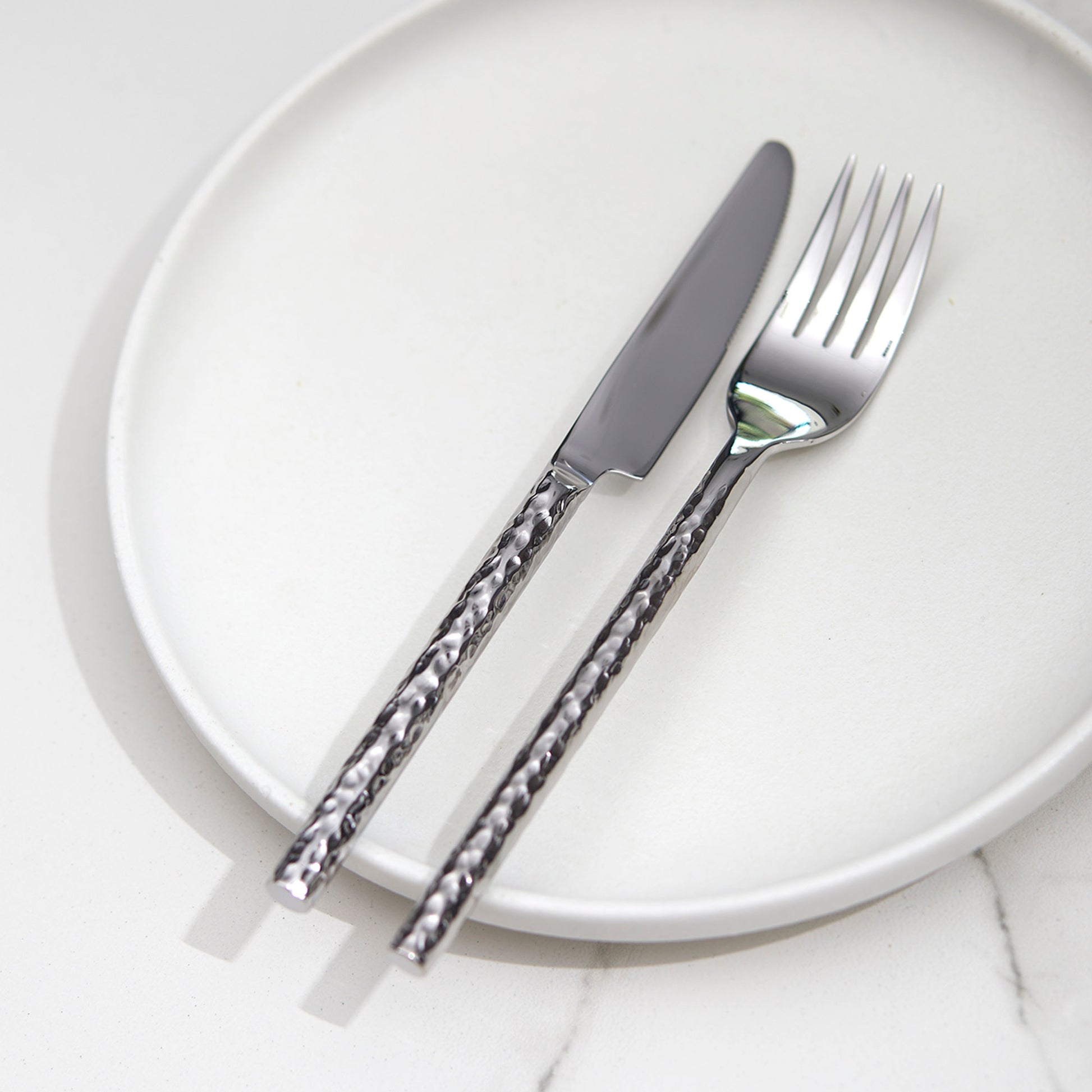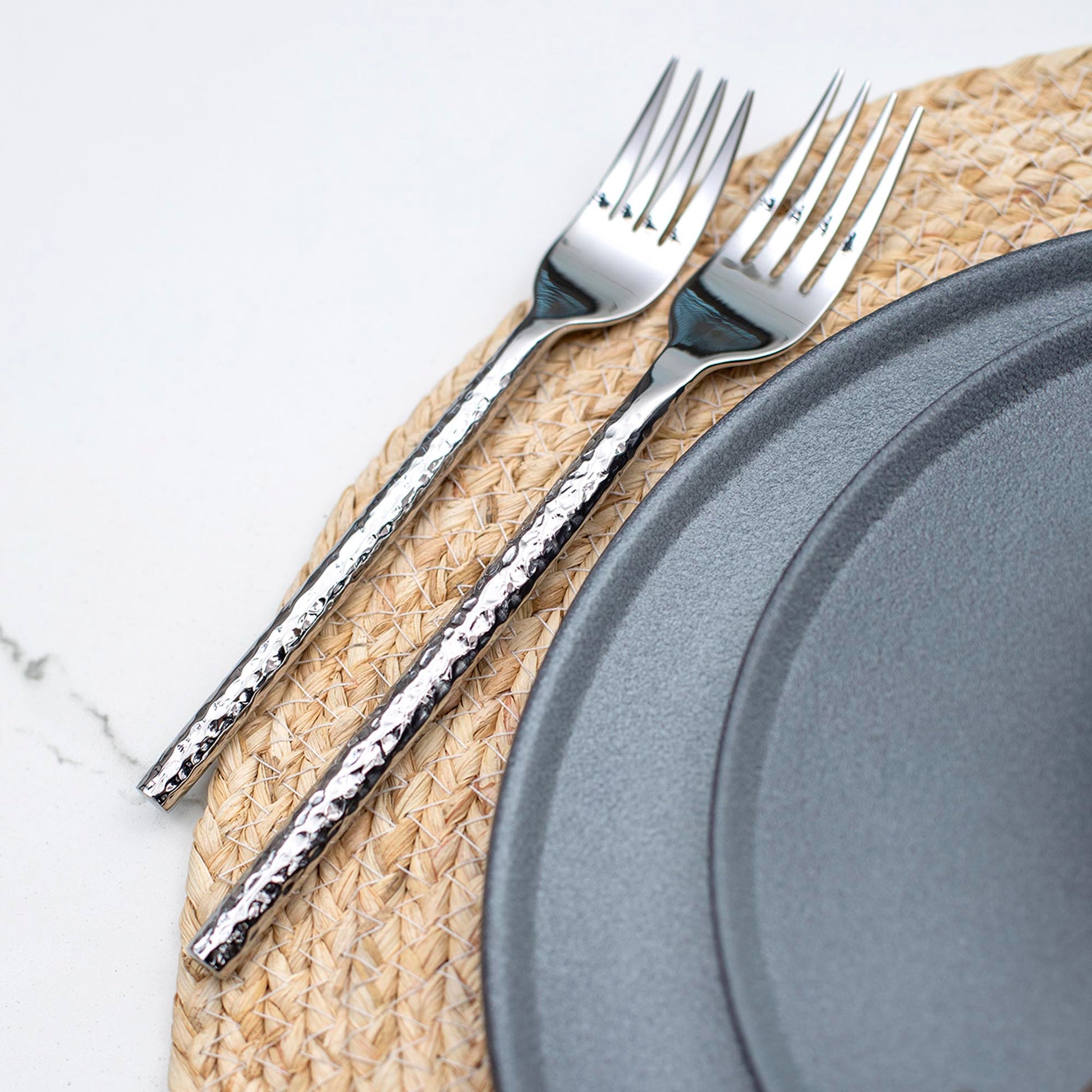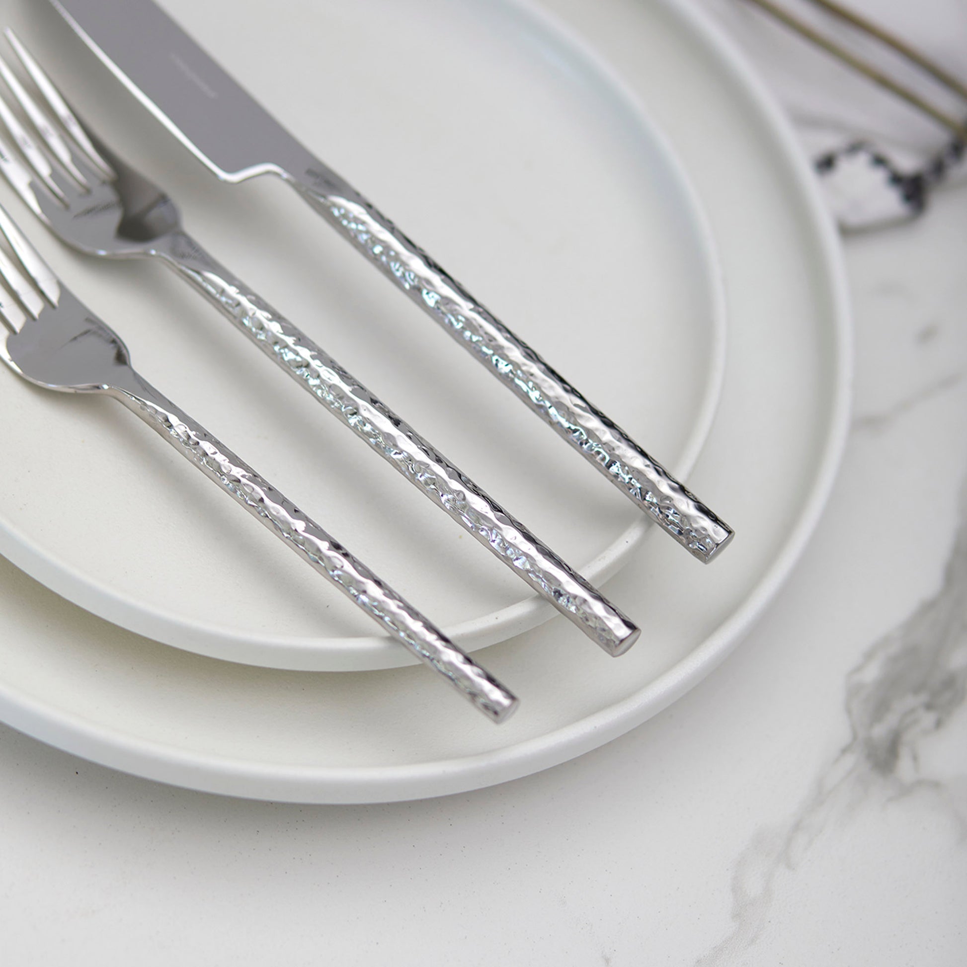 Fabricadas en acero inoxidable 304 con una terminación martillada brillante, estas piezas combinan modernidad y funcionalidad. Destacan por su resistencia a la corrosión, durabilidad y facilidad de limpieza, manteniendo su brillo impecable con el uso diario. Su diseño ergonómico y peso cuidadosamente balanceado ofrecen una experiencia gastronómica cómoda y sofisticada.