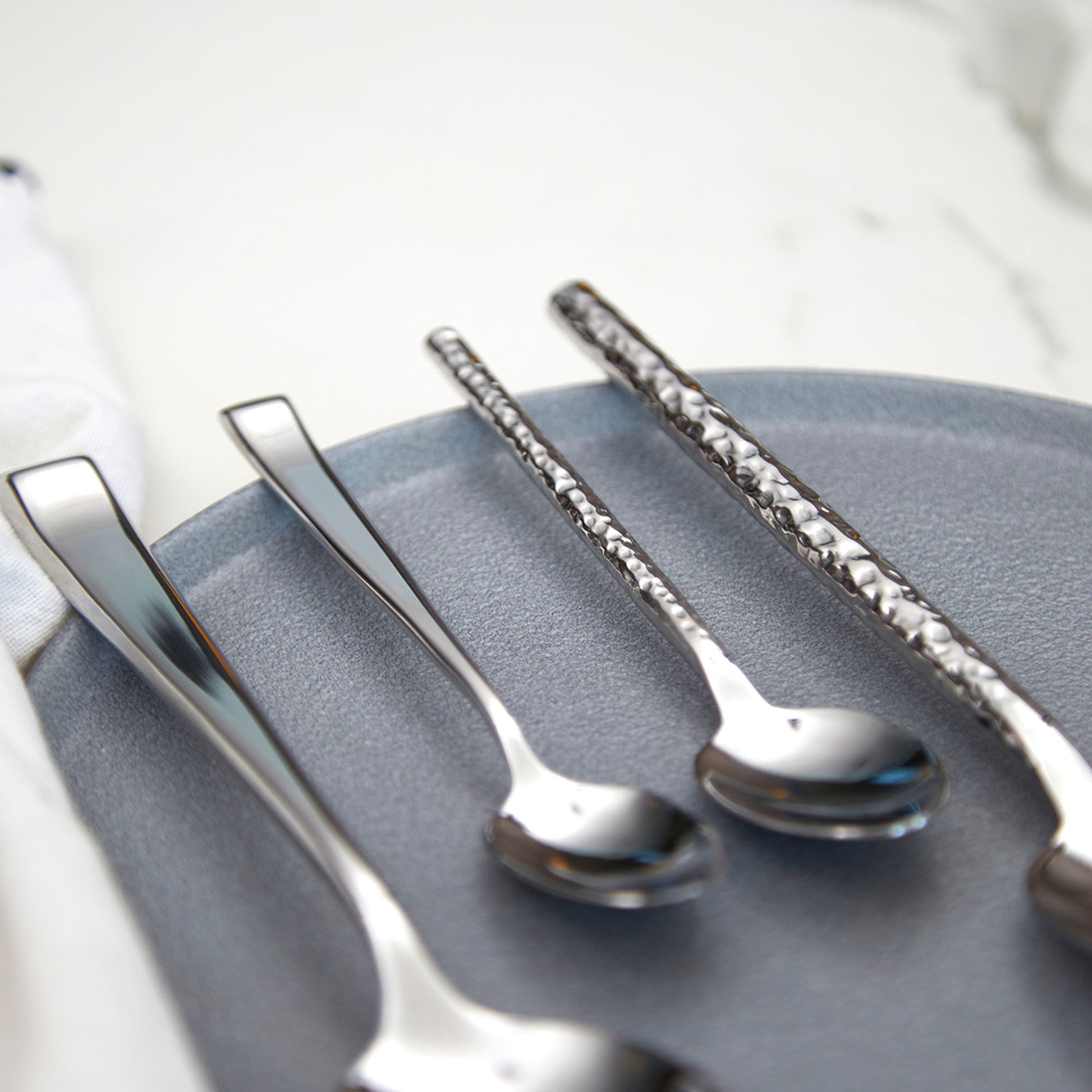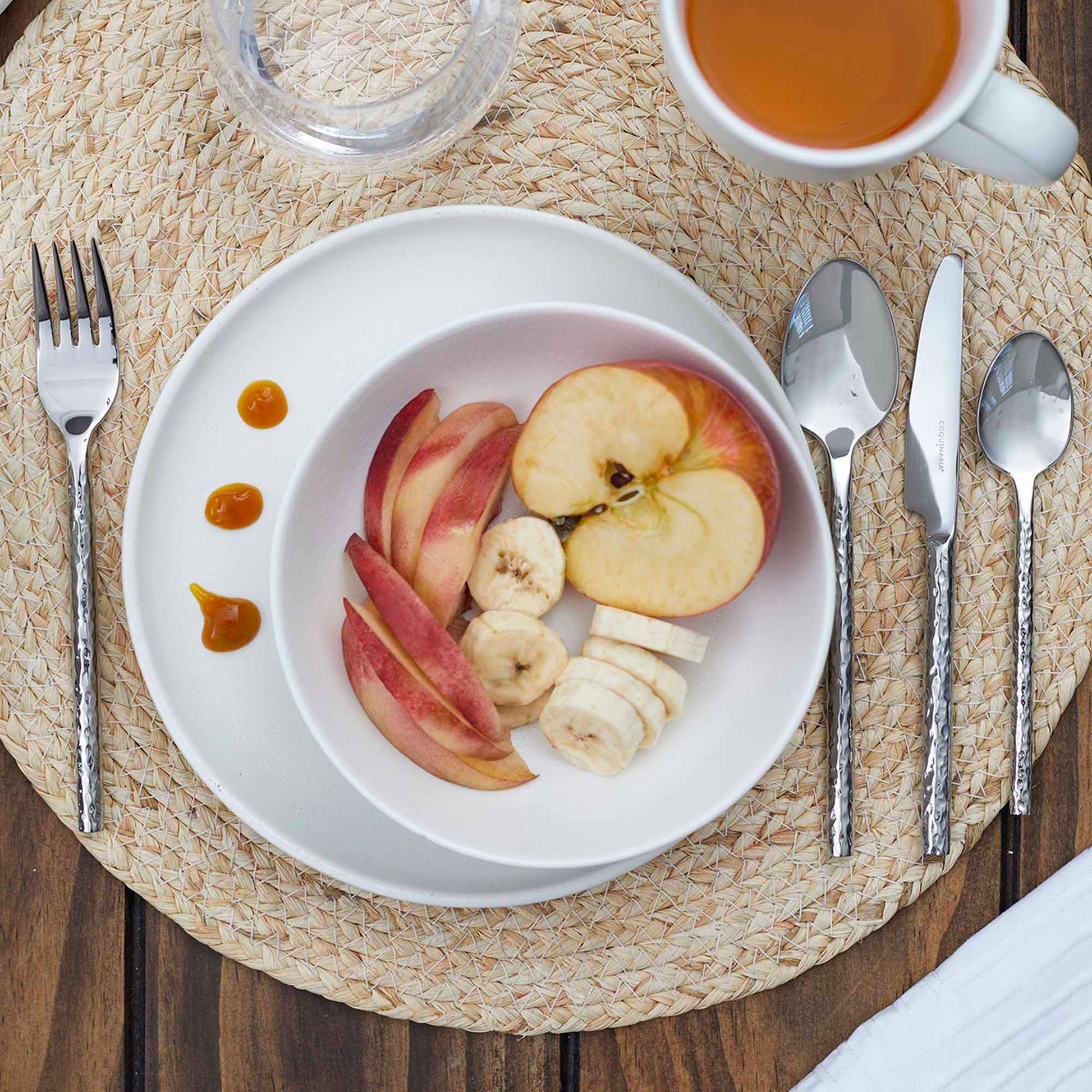 Descubre el set de cuchillería Hammered Coquinaria, diseñado para realzar cada momento en torno a la mesa. Este completo conjunto incluye tenedores, cuchillos y cucharas tanto para comida como para postre, además de cucharas de té, un detalle que marca la diferencia al ofrecer un set armonizado y completo en un solo modelo.