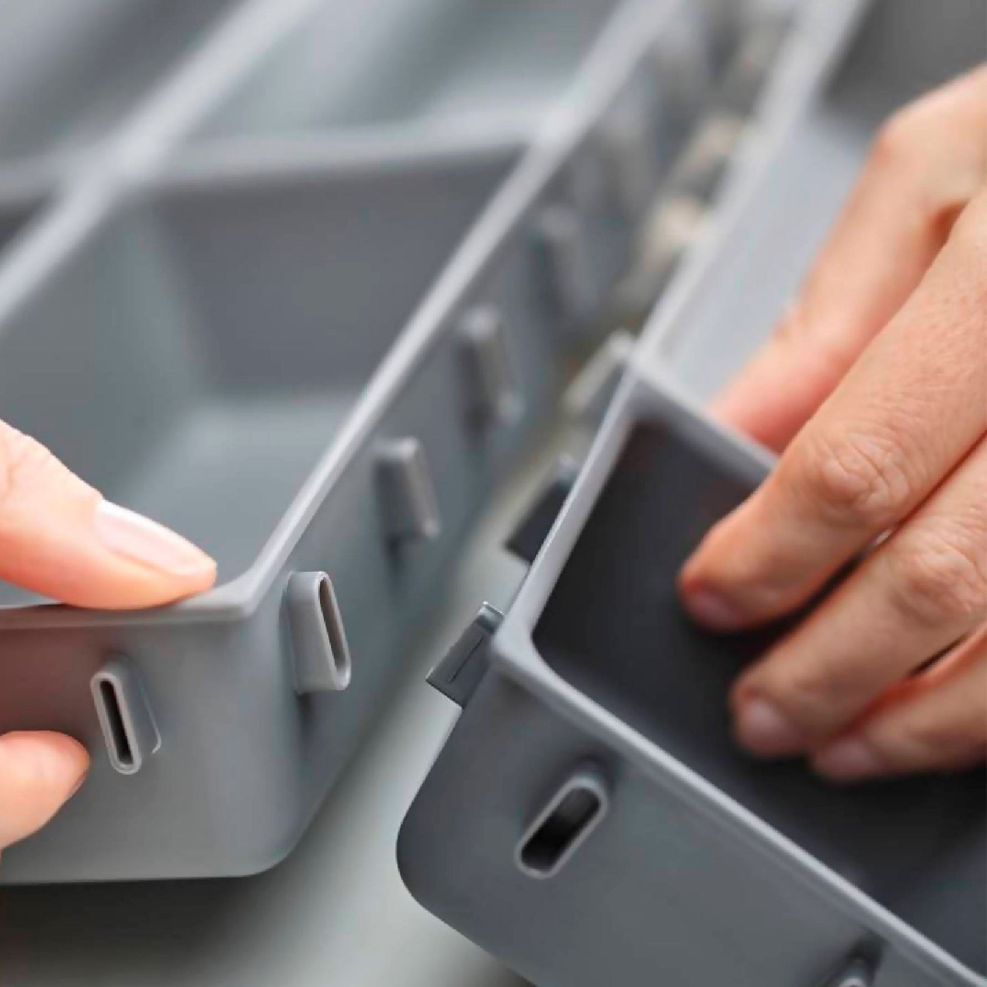 El Set Organizador Cajones Blox 7 Piezas Joseph Joseph incluye 7 bandejas que se enganchan entre si para que puedas usarlas juntas o por separado, adaptándose al tamaño de tus cajones. Este sistema modular te permite diferentes combinaciones dependiendo de tus necesidades. Son perfectas para guardar utensilios de cocina, cubiertos, maquillaje, joyas y artículos de escritorio separando cada elemento en una bandeja distinta. Todas tienen pies antideslizantes para evitar que se muevan dentro del cajón.