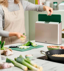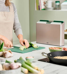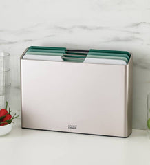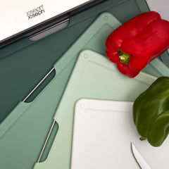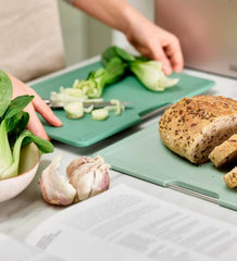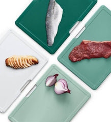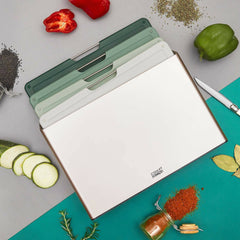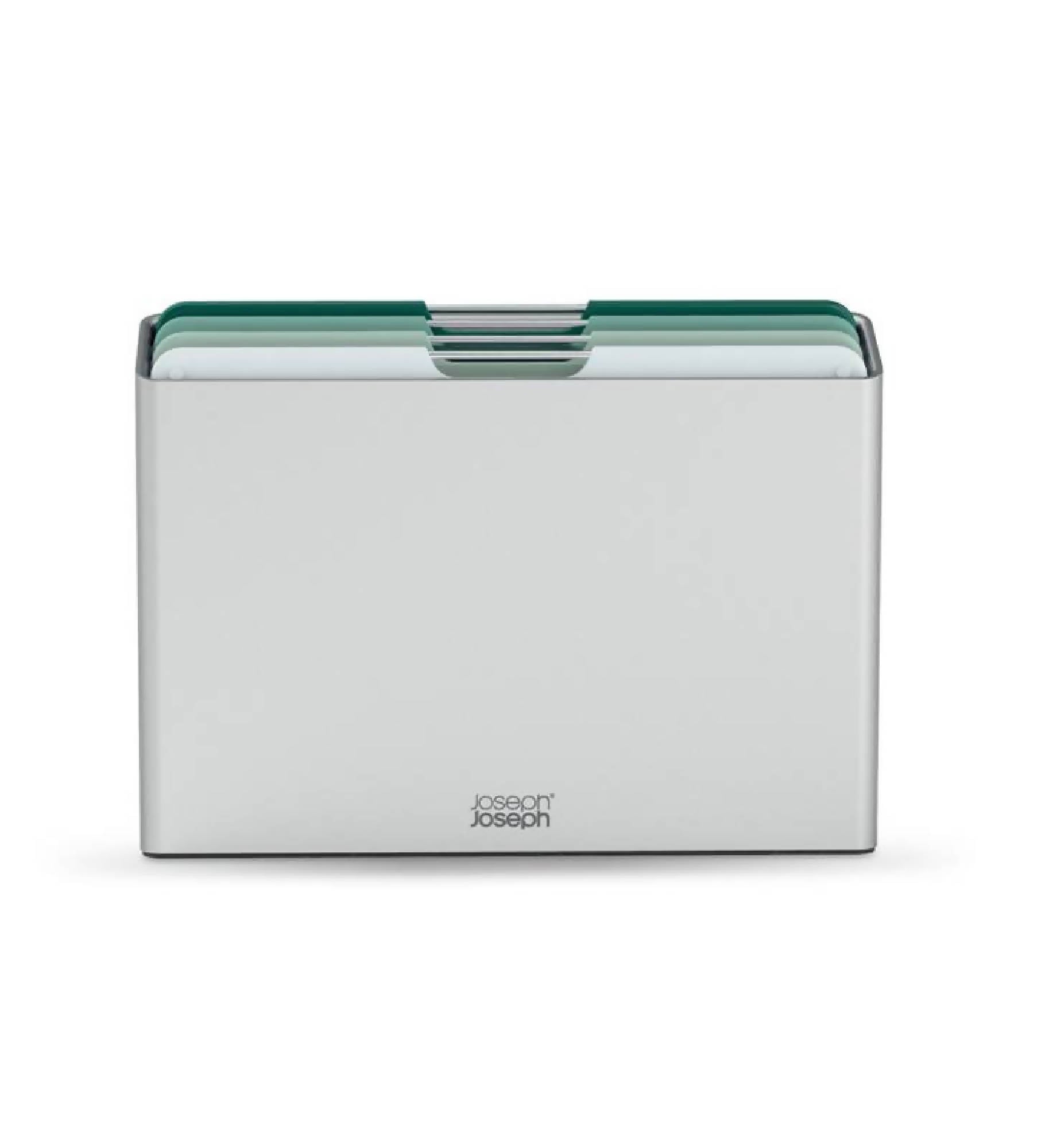 El Set Tablas Folio Salvia L Joseph Joseph incluye un estuche plástico color gris que mantiene ordenadas 4 tablas de cortar de distintos colores en tonos verde salvia. Las 4 tablas sirven para cortar los distintos alimentos sin mezclarlos, evitando la contaminación cruzada al cocinar. Las tablas tienen una superficie de corte texturizada en ambas caras que no daña los cuchillos y además cuentan con topes antideslizantes. Se pueden sacar fácilmente del estuche gracias al inteligente diseño en ángulo y las barras de acero inoxidable. El estuche mantiene las tablas separadas, lo que permite que circule el aire y se sequen más rápido. Forma parten de la colección Salvia de Joseph Joseph en tonos verdes que inspira tranquilidad en tu hogar.