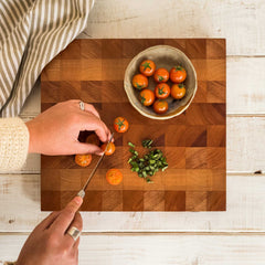 La tabla de corte profesional J es una tabla End Grain hecha con madera de roble del sur de Chile. Diseñada especialmente para el mercado estadounidense, consiste en un bloque compacto con superficie lisa y biseles inferiores a 45°, que le dan un aspecto liviano y sofisticado. Hecha a mano en La Araucanía con despuntes de madera, promueve un uso eficiente del recurso. Su cubierta End Grain ofrece propiedades de auto-curación que protegen los cuchillos y mantienen sus filos por más tiempo. Además, su tratamiento con aceite-cera food safe reduce la contaminación y permite cocinar de forma segura, limpia y sin plásticos.