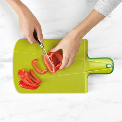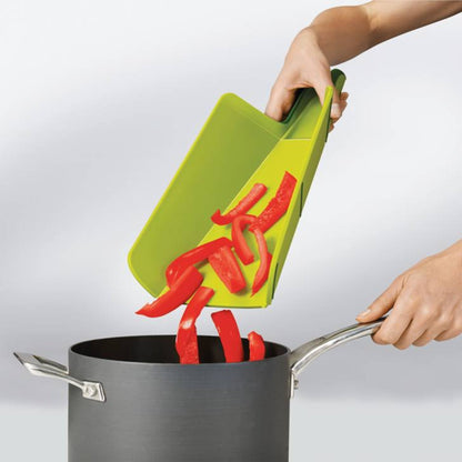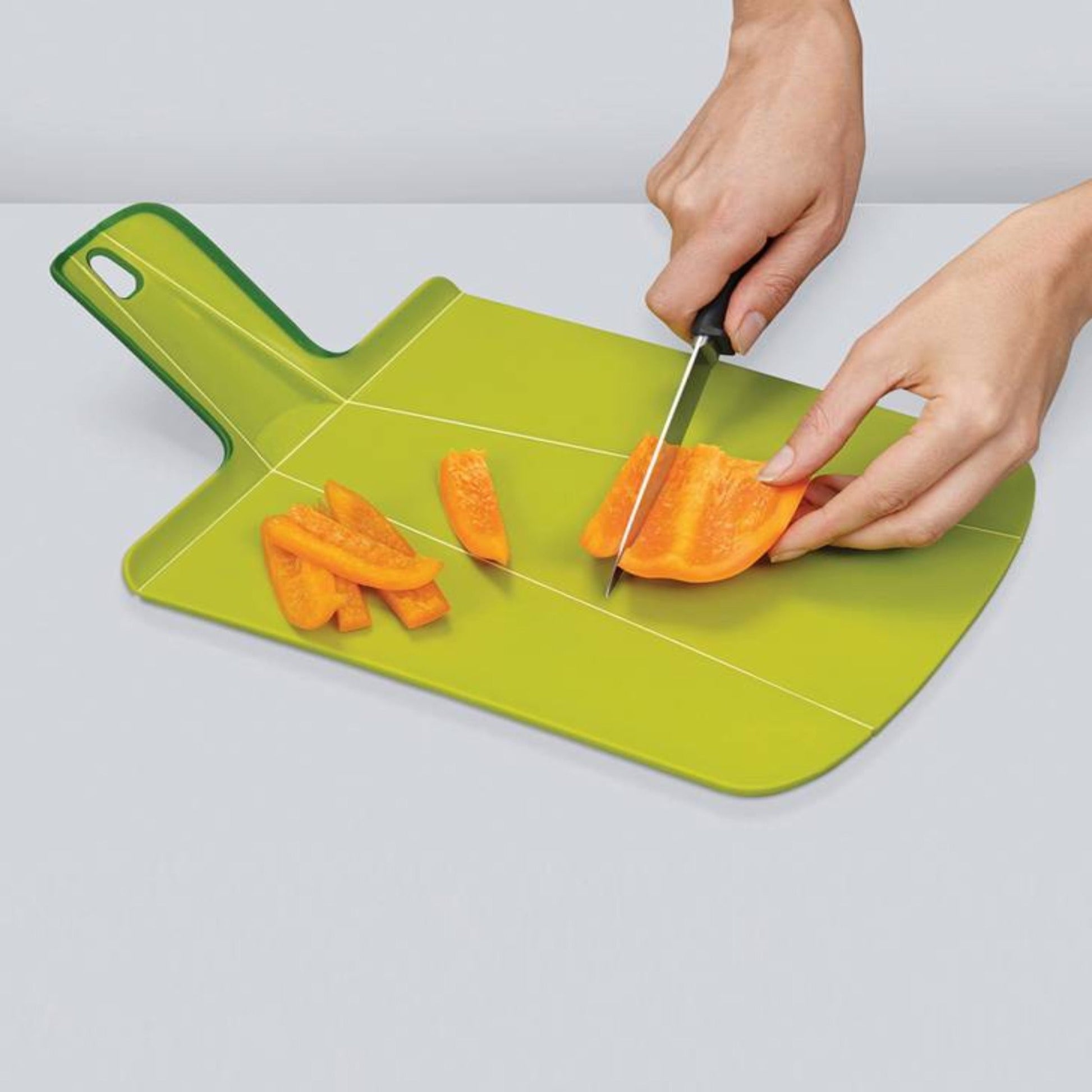 La Tabla Plegable Verde de Joseph Joseph es una herramienta versátil en la cocina. Su superficie texturada protege el filo de tus cuchillos mientras cortas. Con un simple apretón en el mango, los lados se pliegan, formando un canal que facilita verter los ingredientes directamente a tus recipientes. Además, cuenta con topes antideslizantes para mayor estabilidad mientras trabajas. Una solución práctica y funcional para tus tareas culinarias diarias.