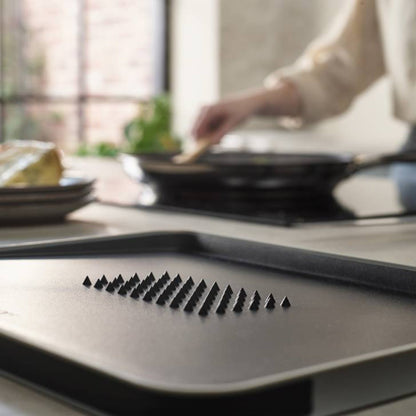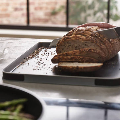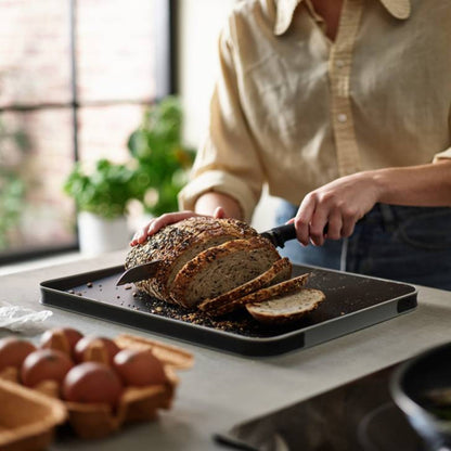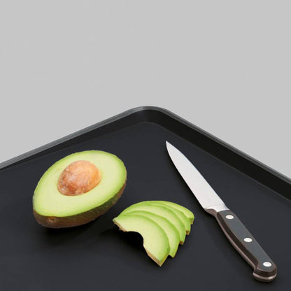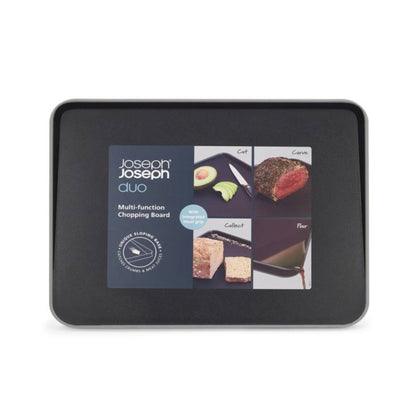 La Tabla Multifunción Negra Duo Joseph Joseph tiene 2 lados con distintos propósitos. El lado liso sirve para cortar y preparar todo tipo de ingredientes. El lado opuesto tiene puntas en el centro que ayudan a afirmar la carne para poder cortarla. Además, su superficie en ángulo y bordes altos ayudan a recolectar el jugo de la carne y verterlo fácilmente gracias a sus esquinas redondeadas. Por último borde de goma antideslizantes