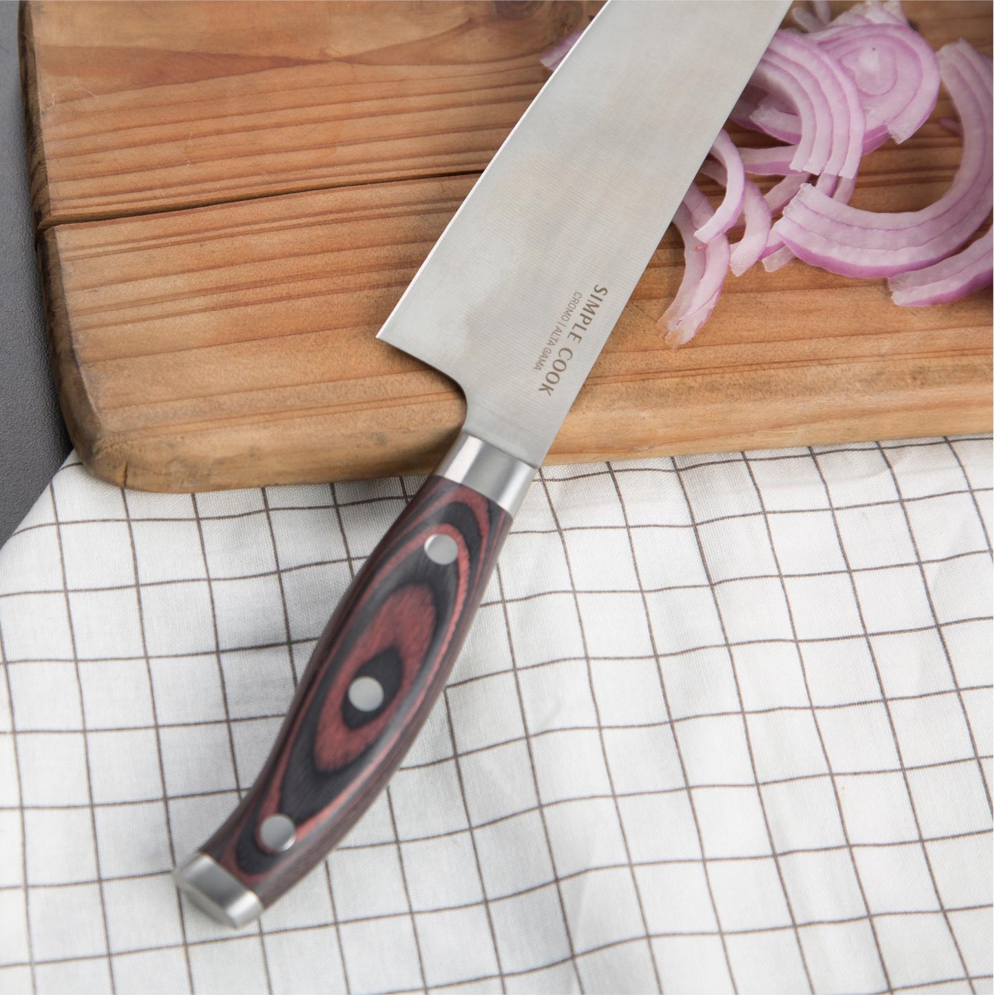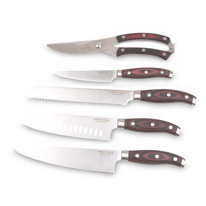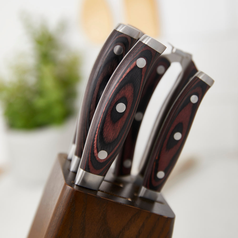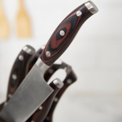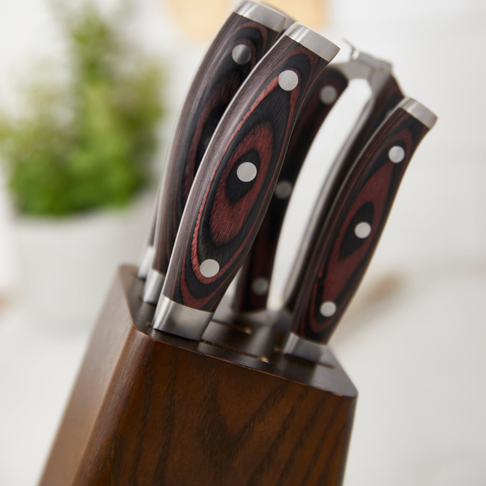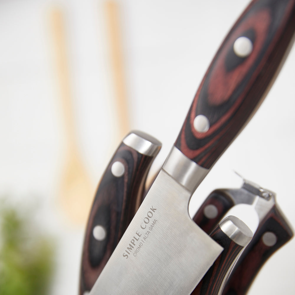 • Características Especiales Recubrimiento antiadherente, Cuchillo Chef 8", Cuchillo para rebanar 7", Cuchillo de pan 8", Cuchillo pelador 4,5", Tijeras