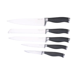 Este set incluye un cuchillo de chef, pan, fileteador, multiusos y pelador, cubriendo todas tus necesidades culinarias. Perfecto para quienes buscan calidad y estilo en su cocina. ¡Haz de cada comida una experiencia más práctica y profesional!