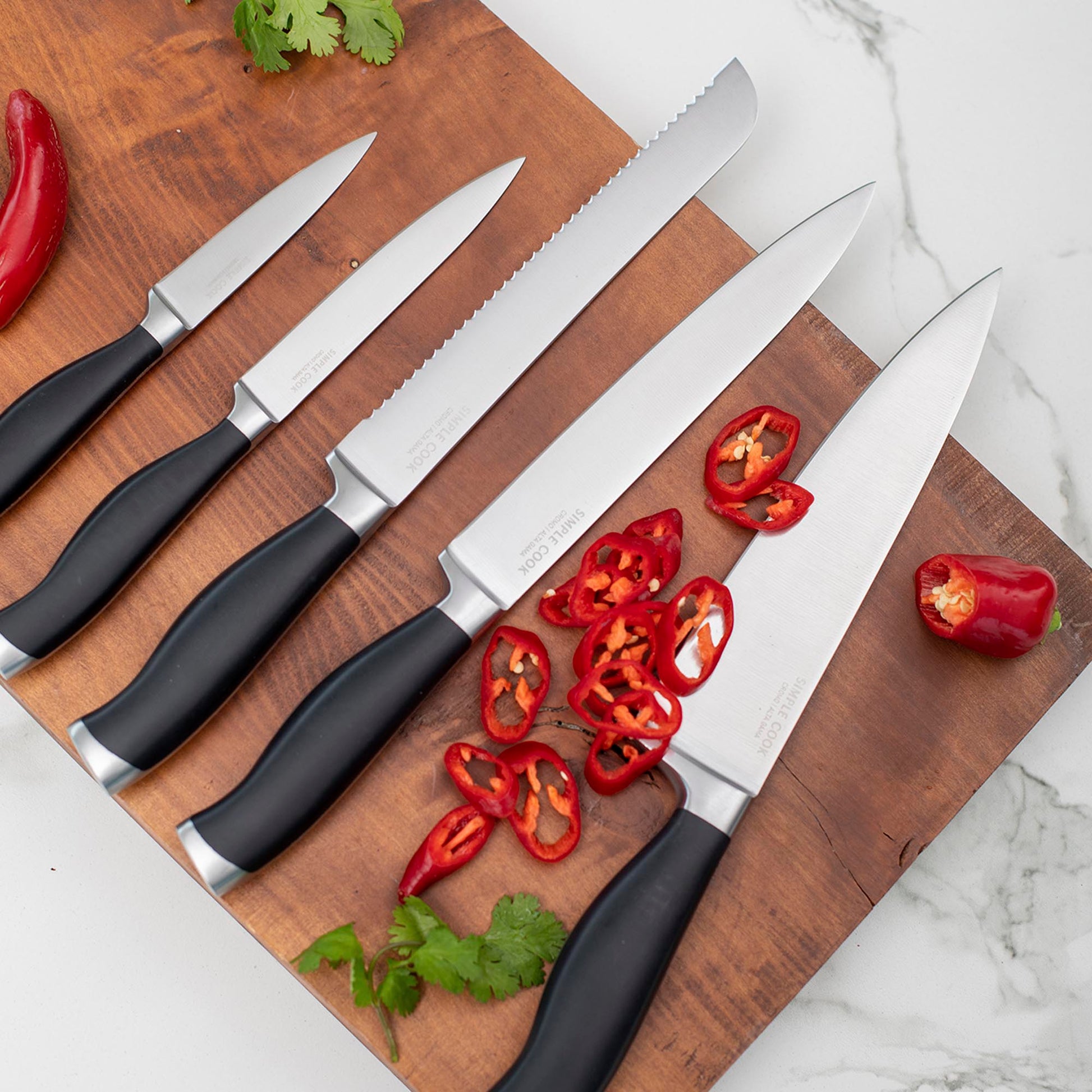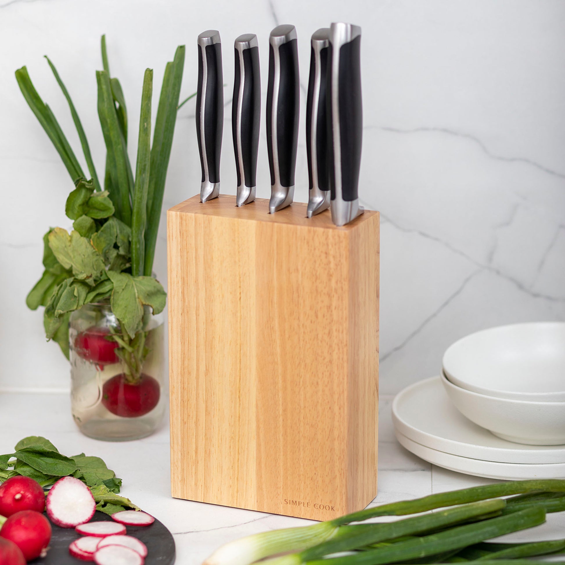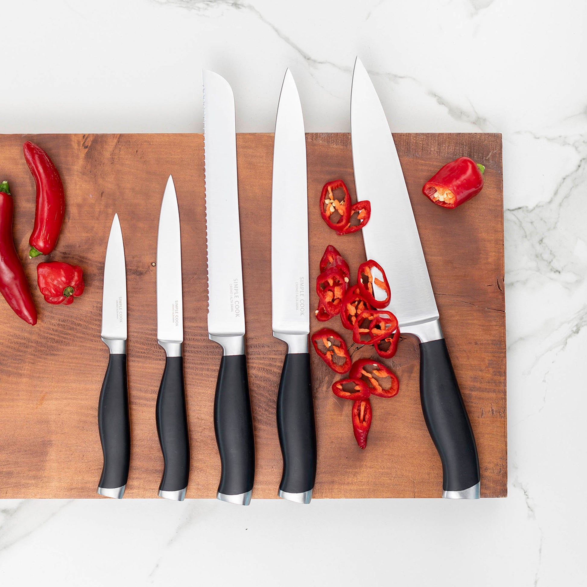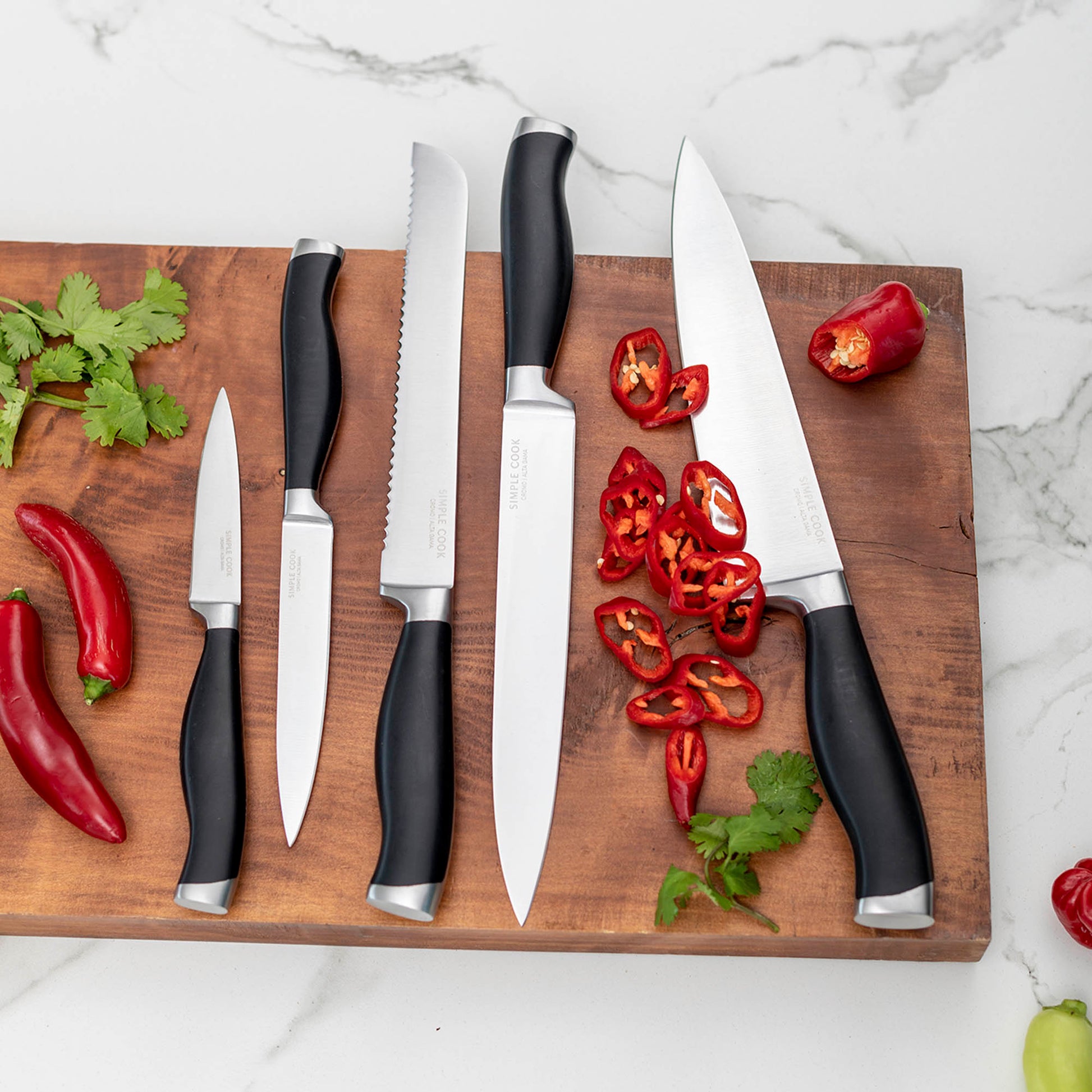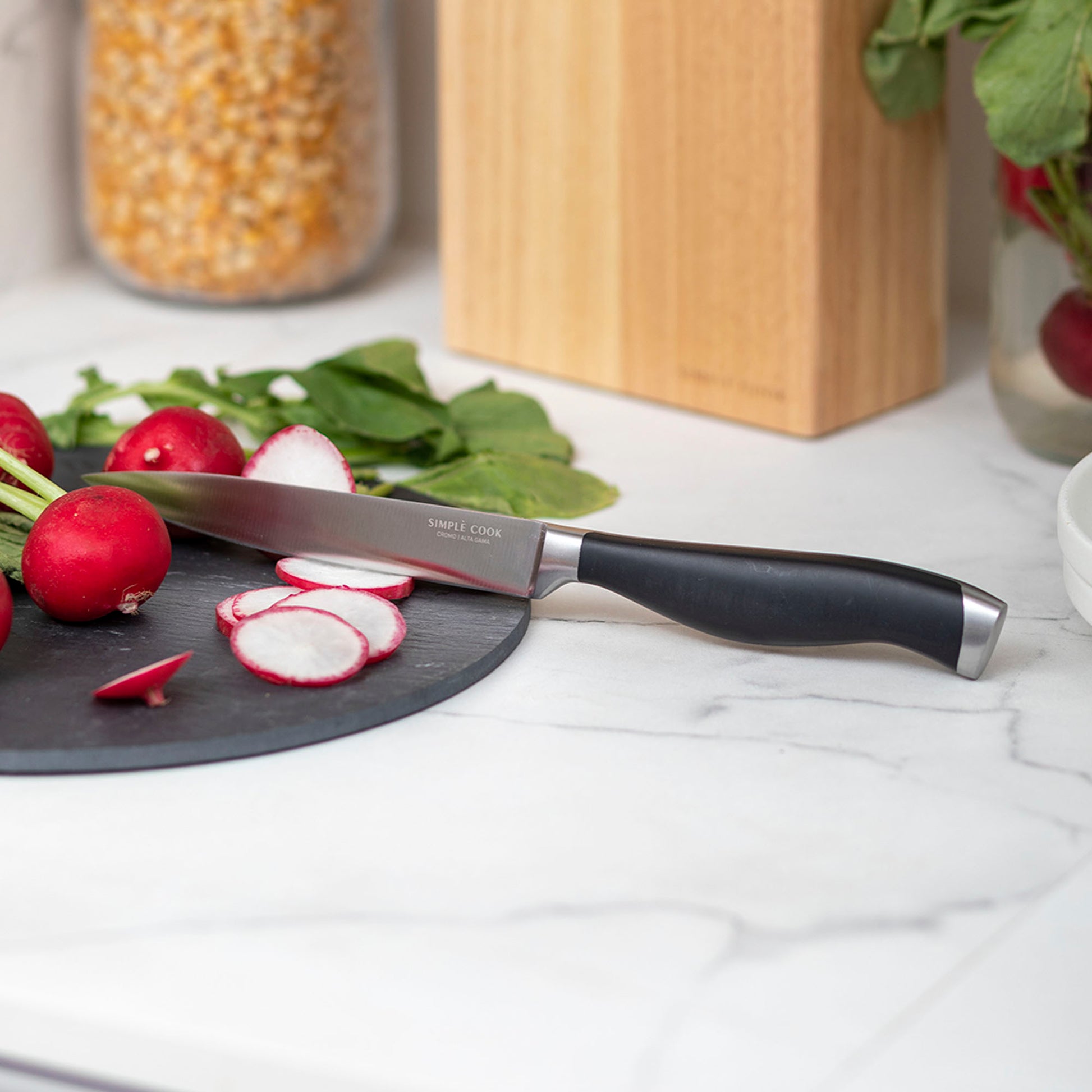 Equipa tu cocina con el Taco Cuchillos Boston 6 Pzs Simple Cook, un set funcional y elegante que incluye 5 cuchillos esenciales y un práctico taco de madera. Diseñados para ofrecer precisión y comodidad, cuentan con mangos ergonómicos antideslizantes y hojas de acero inoxidable 3Cr13, resistentes al desgaste y fáciles de afilar.