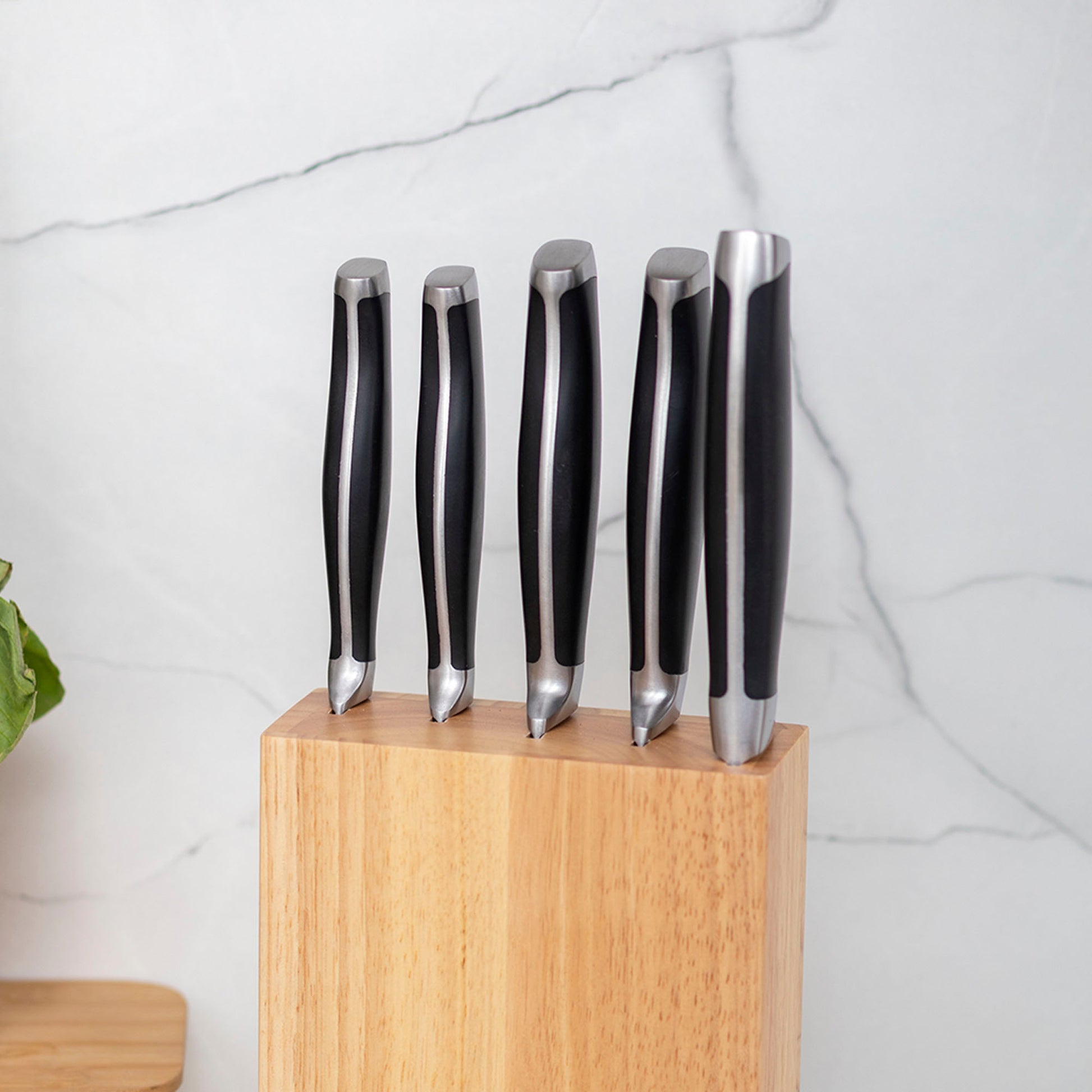 Este set incluye un cuchillo de chef, pan, fileteador, multiusos y pelador, cubriendo todas tus necesidades culinarias. Perfecto para quienes buscan calidad y estilo en su cocina. ¡Haz de cada comida una experiencia más práctica y profesional!