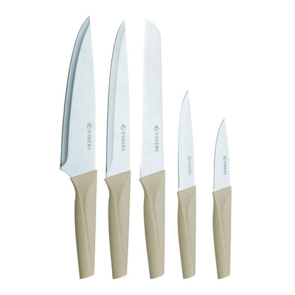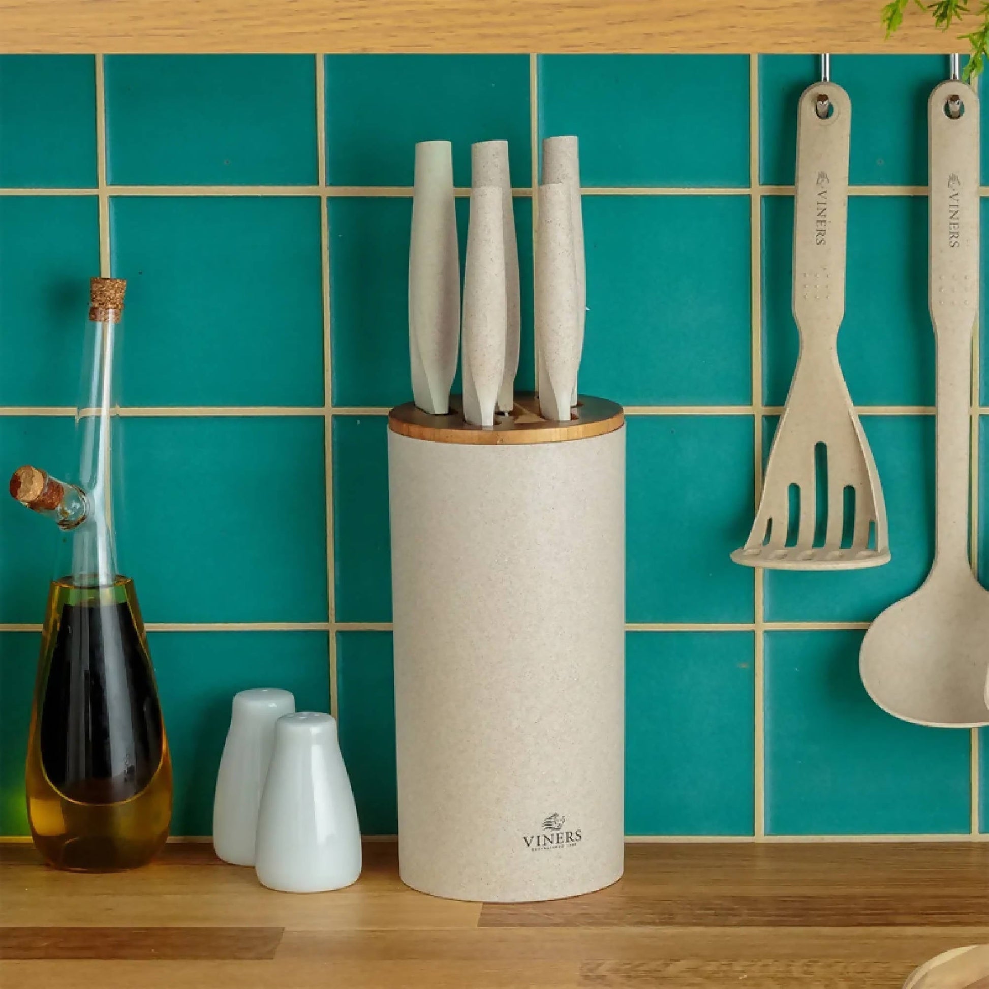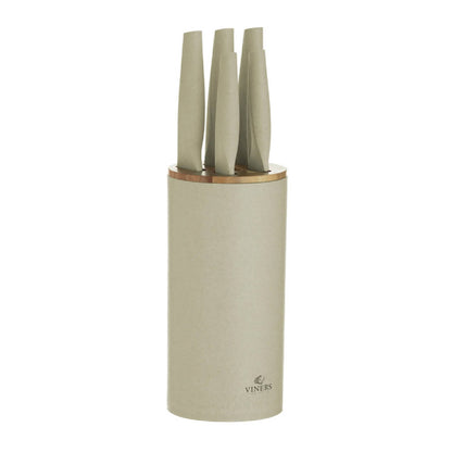 El taco de cuchillos Viners Organic Natutal tiene todo lo que quiere una cocina ecológica. Cada cuchillo de acero reciclado se almacena de manera segura y fácil en el bloque de cuchillo de material mixto, de fibra de trigo con tapa de bambú. El bloque de cuchillos y los mangos están fabricados con un 35% de fibra de trigo y al menos un 80% de materiales reciclados componen las hojas. Fabricado con acero reciclado con los más altos estándares para garantizar durabilidad y resistencia. Estos cuchillos de acero inoxidable son resistentes a la oxidación y deben lavarse a mano. El juego incluye: 1 taco de cuchillos, 1 cuchillo de chef, 1 cuchillo de pan, 1 cuchillo de trinchar, 1 cuchillo de uso general, 1 cuchillo de cocina. Viners existe desde hace más de 110 años y se ha convertido en una marca británica muy querida y un nombre familiar, impregnado de herencia.